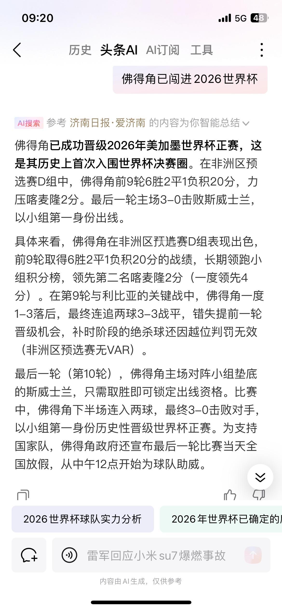 咱国足的天又塌了,连佛得角都闯了世界杯正赛了,这两天国足又要睡不着觉! 要认真查一下世界地图才能知道这个国家在哪里,佛得角是处于大西洋的一个岛国,面积只有4033平方公里,约等于四分之一北京,三分之二上海,二分之一苏州,因此“超越”特立尼达和多巴哥,成为打入世界杯面积最小的国家。他们的人口仅有53万左右,成为世界杯历史上人口第二少的参赛国,仅多于30多万的冰岛。 更难得的是佛得角在小组赛中10轮比赛,7胜2平1负积23分,力压非洲雄狮喀麦隆排名小组第一出线,直接杀入美加墨世界杯,成为了约旦和乌兹别克斯坦后第三支打进入世界杯的新军。 2026年世界杯扩军48支球队,本来是咱们国足打入世界杯的大好机遇,可惜呀!国足不争气呀,就这样浪费了这样的好机会,只能等着四年又四年了……