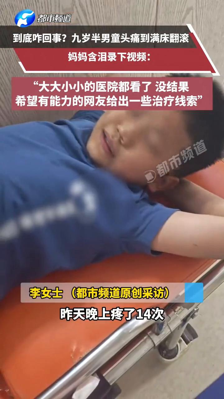 到底咋回事?九岁半男童头痛到满床翻滚,四处求医无果,妈妈含泪录下视频:希望有能力的网友给出一些治疗线索。 都市频道。 10月13日(采访)河南许昌。李女士(都市频道原创采访):昨天晚上疼了14次,疼两三分钟,等四五分钟又一阵,持续将近两个小时。今年头疼最厉害的一次,十来天头一次疼70分钟左右,大大小小医院都给他看了(没结果),他说他也不知道为什么会疼。 我真心希望网友的力量能为我们带来一点(治疗)线索。