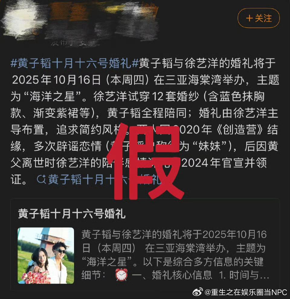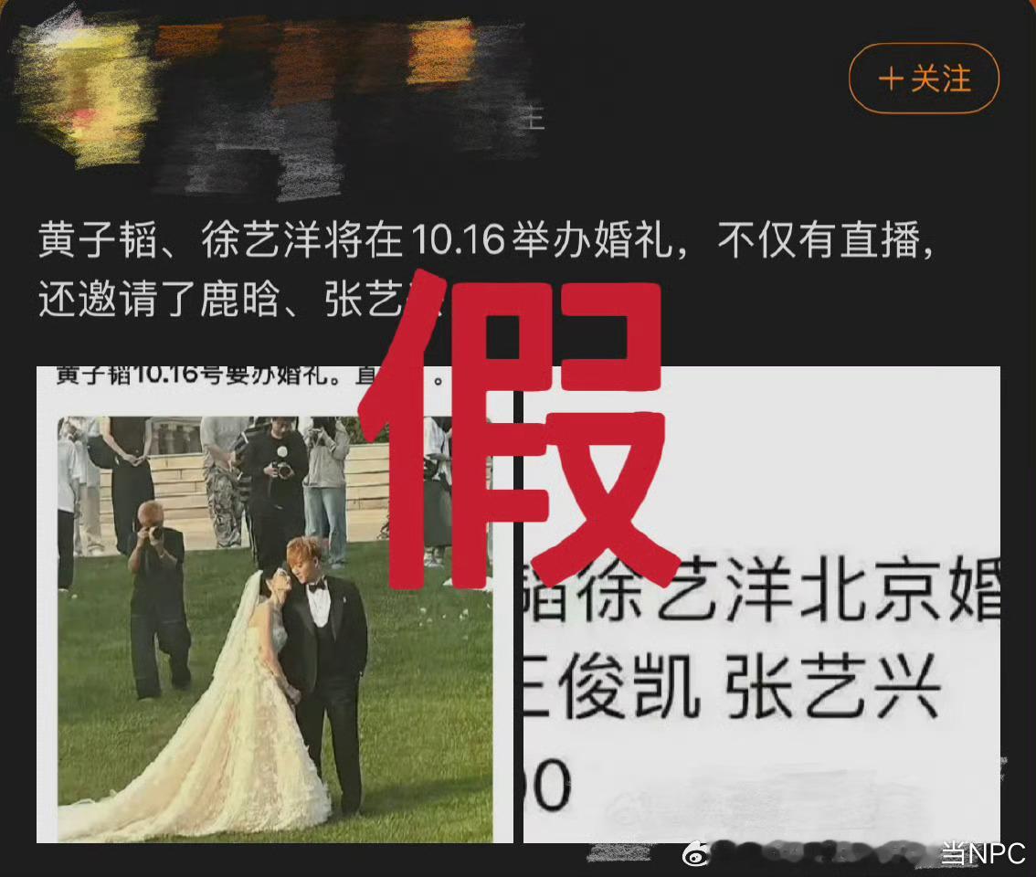工作室辟谣“黄子韬徐艺洋世纪婚礼”等不实谣言1.网传婚礼嘉宾是假的2.没有邀请任
