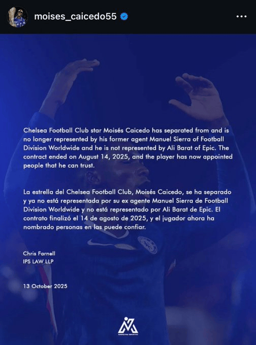 [流言板]切尔西中场凯塞多Ins官宣和经纪人解除合作,随后又突然删帖