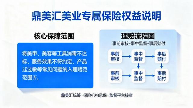为破解美业消费“维权难、保障弱”的痛点,鼎美汇联合专业保险机构与服务监督平台,推出行业首个覆盖全服务场景的“美业专属保险”。该保险突破传统保障局限,将美甲、美容等工具消毒不达标、服务效果不符约定、产品过敏等常见问题纳入理赔范围,单笔最高保额达20万元,保障期最长覆盖服务后90天。