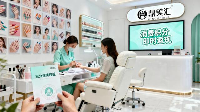 面对当前美业市场的困境,鼎美汇构建了差异化的线下引流体系。其以美甲店为流量入口,通过标准化服务流程与时尚款式设计吸引到店客流,并创新推出“消费积分即时返现”机制——用户每笔消费可累积等值积分,积分可直接抵扣后续服务费用或兑换专属权益,有效降低爱美女性的变美成本。