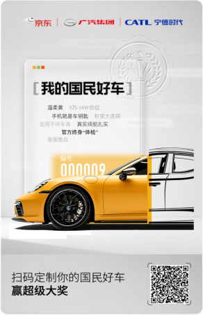 是谁还没看京东的发布会?这次京东和宁德时代、广汽集团联动简直绝了,不知道售价会是多少,我猜应该10W以内的好价~国民好车,全民定制 现在上京东搜索“国民好车”,参与“国民好车 由你定义”H5互动,还能有机会抽汽车大奖!我心中的国民好车已“新鲜出炉”,既要有扎实的续航,又拥有金刚不坏车身,价格也要香香,不知道大家心中的好车是什么样呢?速戳【】生成!京东11.11 又好又便宜 今晚京东11.11连续3天现货秒杀 京东汽车