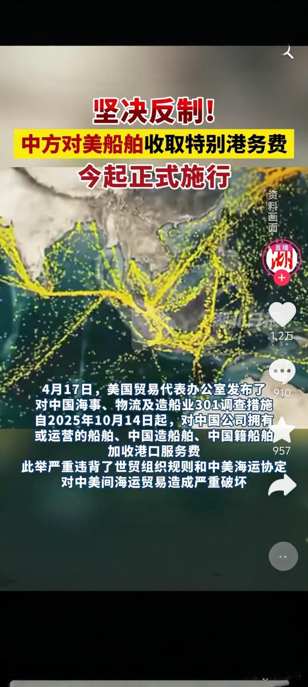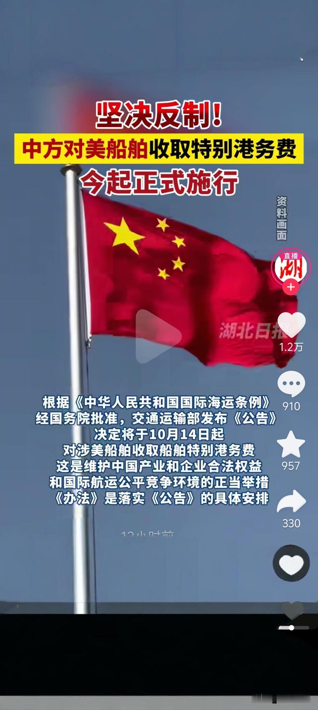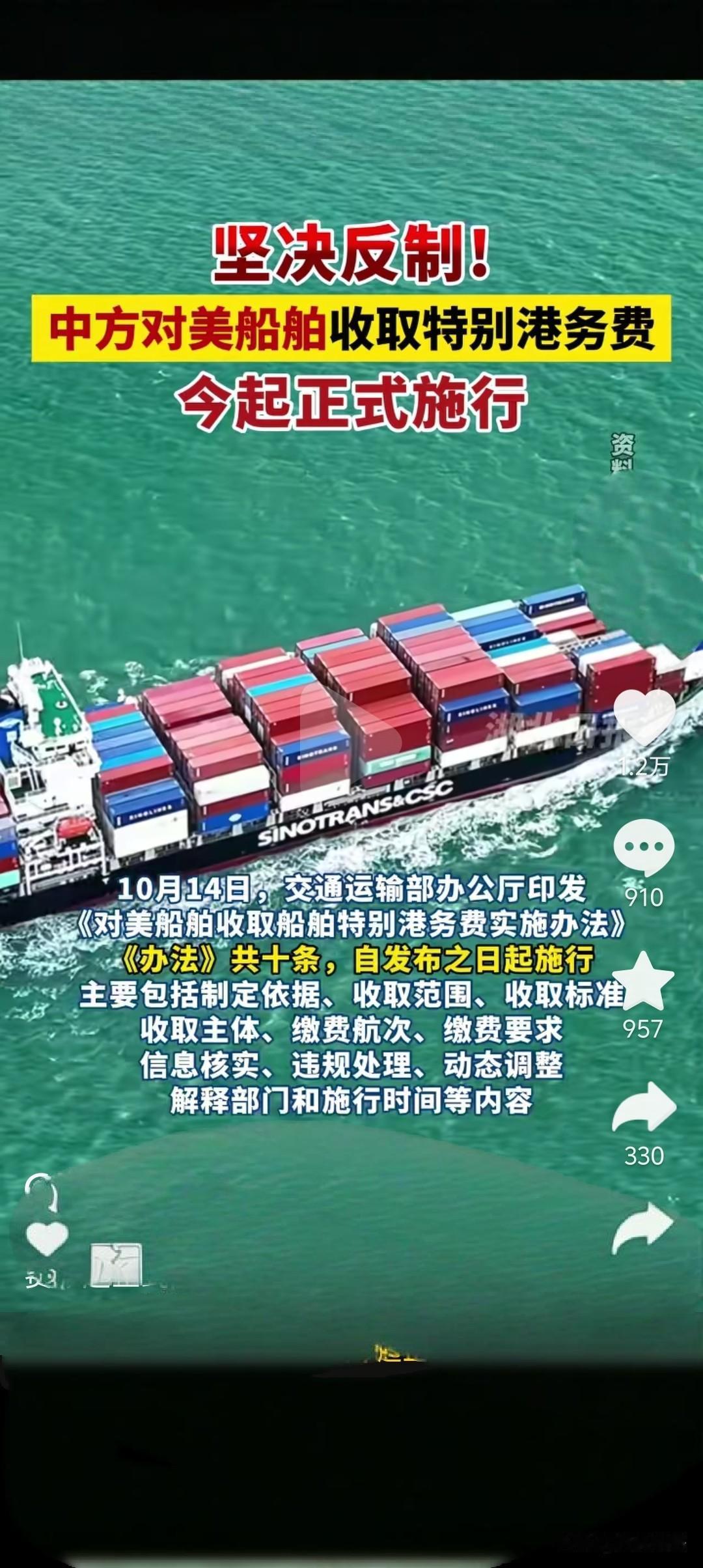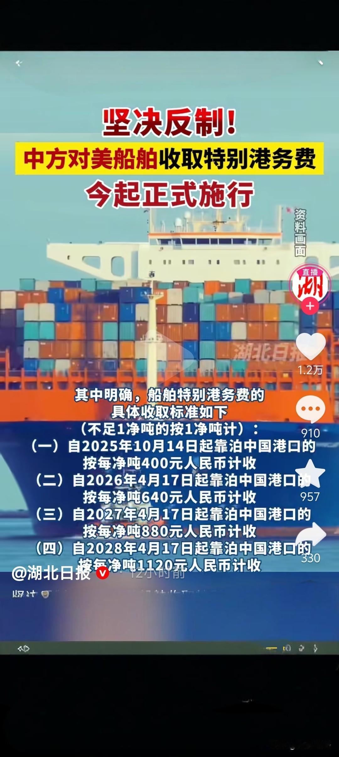 打,奉陪到底,谈 ,大门敞开! 对美的船舶现在开始收取“特别港务费”,10月14号正式开始施行! 来了,我们对美国的船舶开始开征特别港务费!并且每净吨最高达到了1120元,直接干得漂亮! 2025年10月14号,我们的国家终于出手!交通运输部直接发布了《对美船舶收取船舶特别港务费实施办法》,从14号开始对靠泊中国港口的美国船舶开始征收高额的特别港务费,针对美方无理由加征中国船舶费用的对等反制办法。 剑已经出窍了。 2025年4月17号,美国贸易的代表办公室开始宣布对中国的海事和物流和造船业启动了“301调查”,并且还计划对中国籍、中国造、中国运营的船舶开始加收取港口服务费。 当时我们的国家回应:这个举措已经严重违反WTO规则以及中美海运协定,破坏了国际航运公平秩序,可是呢? 终于我们国家开始出手了,直接批准,甚至交通运输部也出来发布公告了,决定实施对等的反制。 并且时间都出来了。 2025年10月14号起,每净吨400元。 2026年4月17号起,每净吨640元。 2027年4月17号起,每净吨880元。 2028年4月17号起,每净吨1120元。 终于腰板挺直了!小米加步枪都敢打,现在怕谁? 建议按秒收费,不服就干! 这就是大国底气!支持国家每一项反制决策! 我们不惹事,但是也绝不怕事。