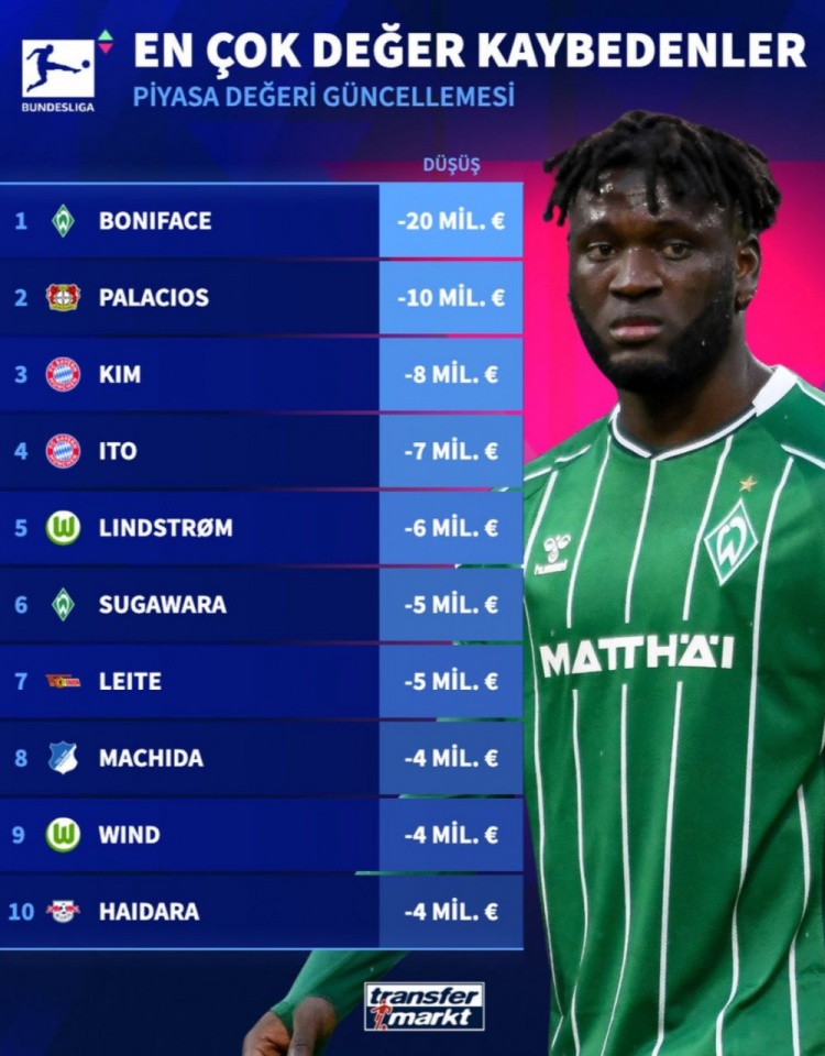 直播吧10月15日讯德国转会市场公布了新一期的德甲球员身价情况,在跌幅榜上,博尼法斯跌2000万欧最多,帕拉西奥斯跌1000万欧位居次席。