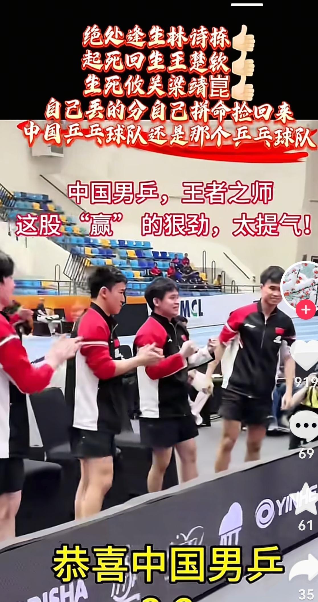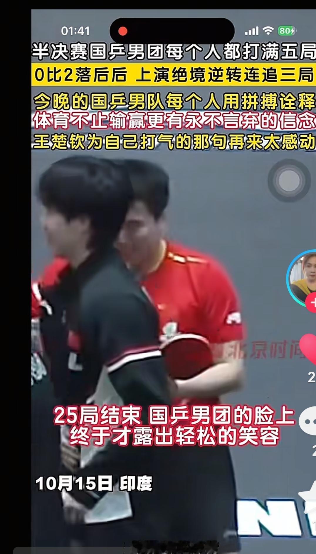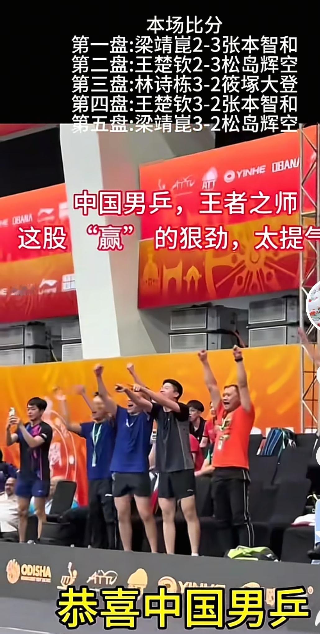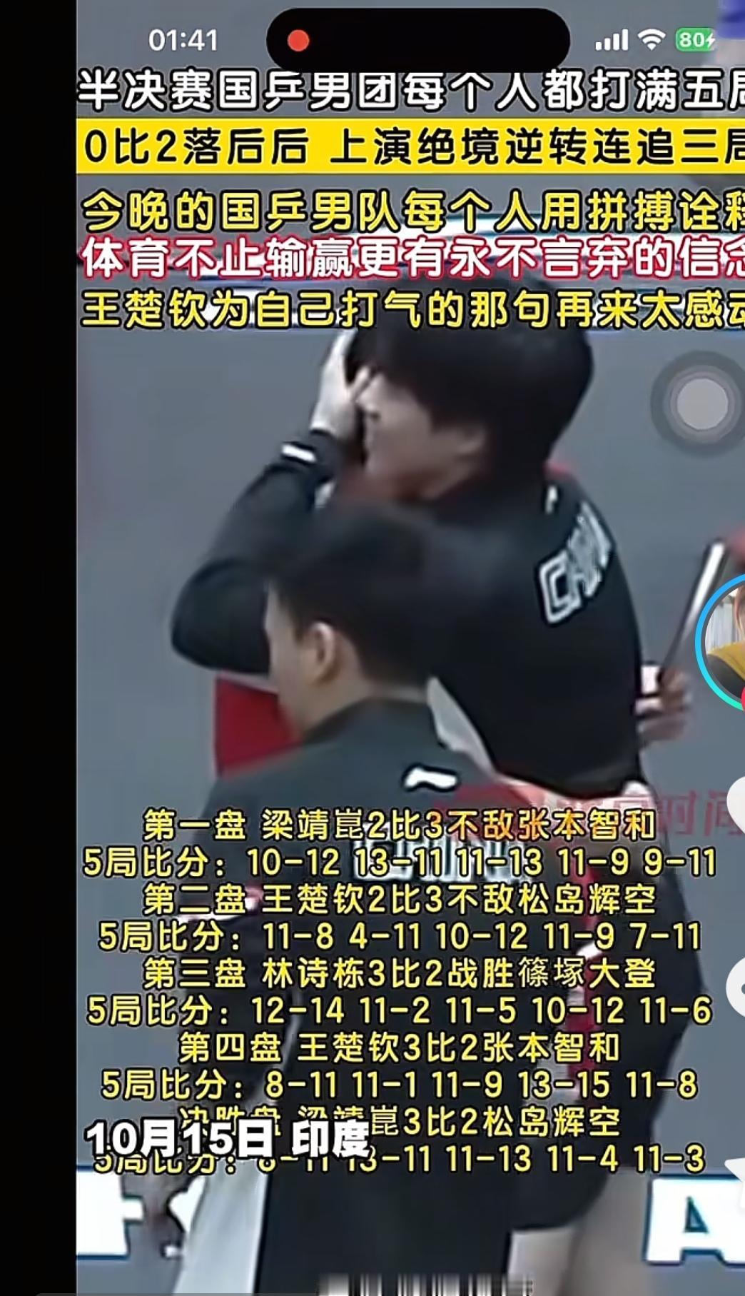 有网友对男团半决赛中日之间的较量总结的太到位了, 他说在先失两盘的前提下, 小石头绝处逢生,打响了战略进攻的第一枪, 王楚钦起死回生,使双方的比赛又回到了原点,日本队的优势一扫而空, 梁靖崑生死攸关,让二追三的逆转在他身上重现。 确实,这是一场险象环生的比赛, 每一个都有失误, 但关键时刻每一个的表现都可圈可点, 他们用信念把不能变成了可能, 他们用意志创造了奇迹, 他们用团队精神书写了传奇, 他们用实力再次捍卫了荣誉, 他们用无可辩驳的事实再次证明了中国男乒还是那个男乒, 夺冠之路不是一蹴而就, 没有一帆风顺的人生, 虽然竞技场是没有常胜将军, 但我们可以永远相信国家队。