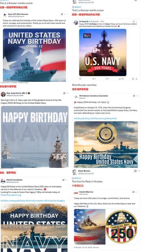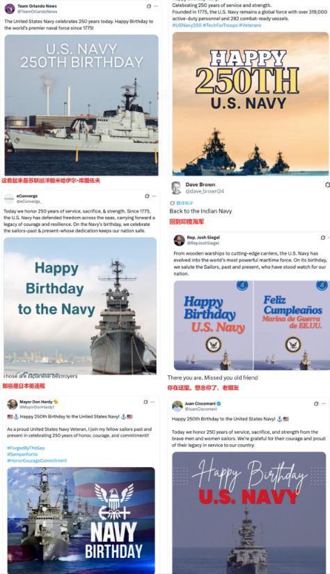 美国海军纪念成立250周年,发了一堆军舰海报,没一个是美国的。 美国海军这波操作真是把人看傻了,好好的 250 周年大日子,愣是办成了 “国际军舰展销会”。 本来想借着成立 250 周年的由头好好秀把肌肉,结果多家机构和官员在外网社媒上发的庆祝海报,没一张上的军舰是美国自己的,这事已经在网上吵翻了天。 要说这纪念活动规格可不低,连特朗普都跑去诺福克海军基地,站在 “杜鲁门” 号航母前发表演说,结果转头就被扒出航母上挂的巨幅海报根本不是为了宣传 —— 那是用来遮丑的,底下藏着 8 个月前碰撞留下的伤,连修都没修,就涂了层和船身颜色一样的油漆糊弄事。这还只是开始,更丢人的还在后头。 当地时间 10 月 13 号,美国海豹突击队博物馆在 X 平台发了条庆祝帖,配的海报看着挺威风,结果眼尖的网友一眼就认出,那军舰根本不是美军的,是把俄罗斯 1164 型 “光荣” 级巡洋舰的照片 P 了下图就拿来用了。 同一天,亚利桑那州州务卿阿德里安・丰特斯也凑了热闹,发的帖文里附了张巡洋舰照片,仔细一看,那是俄罗斯的 “库图佐夫” 号。 后来《华尔街日报》有个记者专门整理了这些乌龙海报,发现里头藏的猫腻可不少:除了俄罗斯的 “乌斯季诺夫元帅” 号巡洋舰,还有丹麦、日本、印度的舰艇,甚至有几张看着就不对劲的,疑似是 AI 生成的假图,连真军舰都算不上了。 这些帖子一出来,评论区立马炸了锅。美国网友看得直冒火,纷纷留言吐槽:“天啊!他们真是太无能了”“这怎么能搞错呢?”“简直可悲到家了”。 有人特意截了图对比,俄罗斯 “光荣” 级巡洋舰上的反舰导弹发射筒一眼就能认出来,跟美军的舰艇设计压根不是一回事,稍微懂点军事的都能看出差别,真不知道发海报的人是眼神不好还是根本没上心。 这压根不是美军第一次干这种蠢事。去年美国独立日的时候,海军太平洋舰队发的庆祝海报里,军机剪影是苏联的苏 - 27,战舰是卡辛级驱逐舰,全是冷战时期的老对手装备,帖子发出去没多久就被悄悄删掉了,连句解释都没有。 再往前数,2019 年佛罗里达州有个共和党众议员,庆祝美国海军生日时,发的居然是俄罗斯基洛夫级巡洋舰的照片,闹了个大笑话。 就在前不久,美海军还发过一张舰长持枪训练的照片,想彰显战备状态,结果被网友挑出一堆错:瞄准镜前后装反了,保护盖没打开,连握枪姿势都不标准,气得专业人士直骂他们不解决问题还想掩盖问题。 网友们都在猜,这到底是怎么回事?是真的认不清自家军舰和外国军舰的区别吗?要说美军里没人懂行,肯定说不过去,海豹突击队博物馆这种专业机构,怎么着也该有几个能分辨舰艇型号的人吧。那是不会用搜索引擎? 随便搜个美国海军标志性军舰,尼米兹级航母、阿利・伯克级驱逐舰的照片一抓一大把,犯不着去扒俄罗斯的军舰图。 这么一想,倒真有人琢磨是不是美军自己的军舰拿不出手了 —— 就像 “杜鲁门” 号那样,撞坏了 8 个月都修不好,只能用海报遮着,其他军舰是不是也有类似的尴尬? 毕竟这些年美军装备维护问题一直没断过,去年还有报道说多艘驱逐舰因故障趴窝,说不定真觉得自家军舰的 “素颜” 太丢人,才顺手拿了别人的图充数。 可不管是哪种原因,这事都实在说不过去。250 周年算是美国海军的 大生日,本该是展现实力、凝聚人心的时刻,结果却因为一连串低级乌龙成了国际笑柄。 发错的海报虽然几小时后大多被删了,但网友的截图早就传得满天飞,想抹都抹不掉。 更让人唏嘘的是,从太平洋舰队到州务卿,从博物馆到国会议员,这么多不同层级的机构和个人接连出错,说明这根本不是偶然的疏忽,而是内部审核、专业素养出了大问题。 以前总说美军装备先进、体系专业,可连自家军舰照片都能弄混,连庆祝海报都要靠 P 图和借图,难免让人怀疑他们的真实状态。 就像网友说的,连自己家的家伙事儿都认不清,还谈什么战斗力。这波乌龙不光丢了面子,更暴露了里子的问题,要是真不把这些 “小疏忽” 当回事,下次闹出来的可能就不是笑话了。