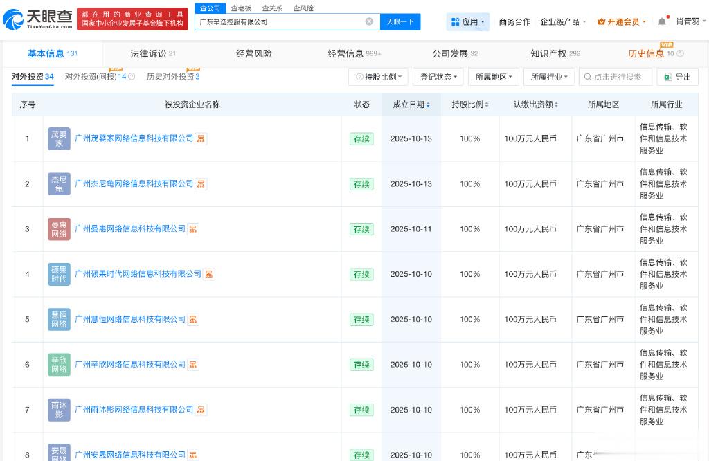 天眼查App显示,近日,广州杰尼龟网络信息科技有限公司、广州茂婴家网络信息科技有限公司等成立。值得注意的是,10月10日至10月13日,辛巴(辛有志)实控公司广东辛选控股有限公司已投资成立8家新公司,上述公司法定代表人均为计梦瑶,注册资本均为100万人民币。