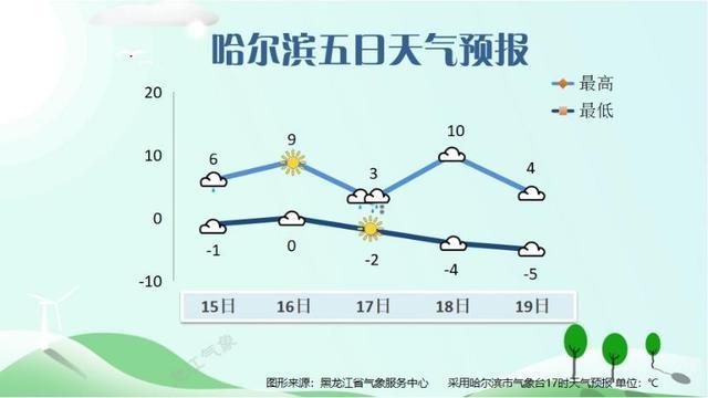 15日白天最高气温:大兴安岭、黑河、伊春北部、齐齐哈尔北部、鹤岗、佳木斯西部、双鸭山西部、鸡西2~4℃,牡丹江7~9℃,其他地区4~6℃。