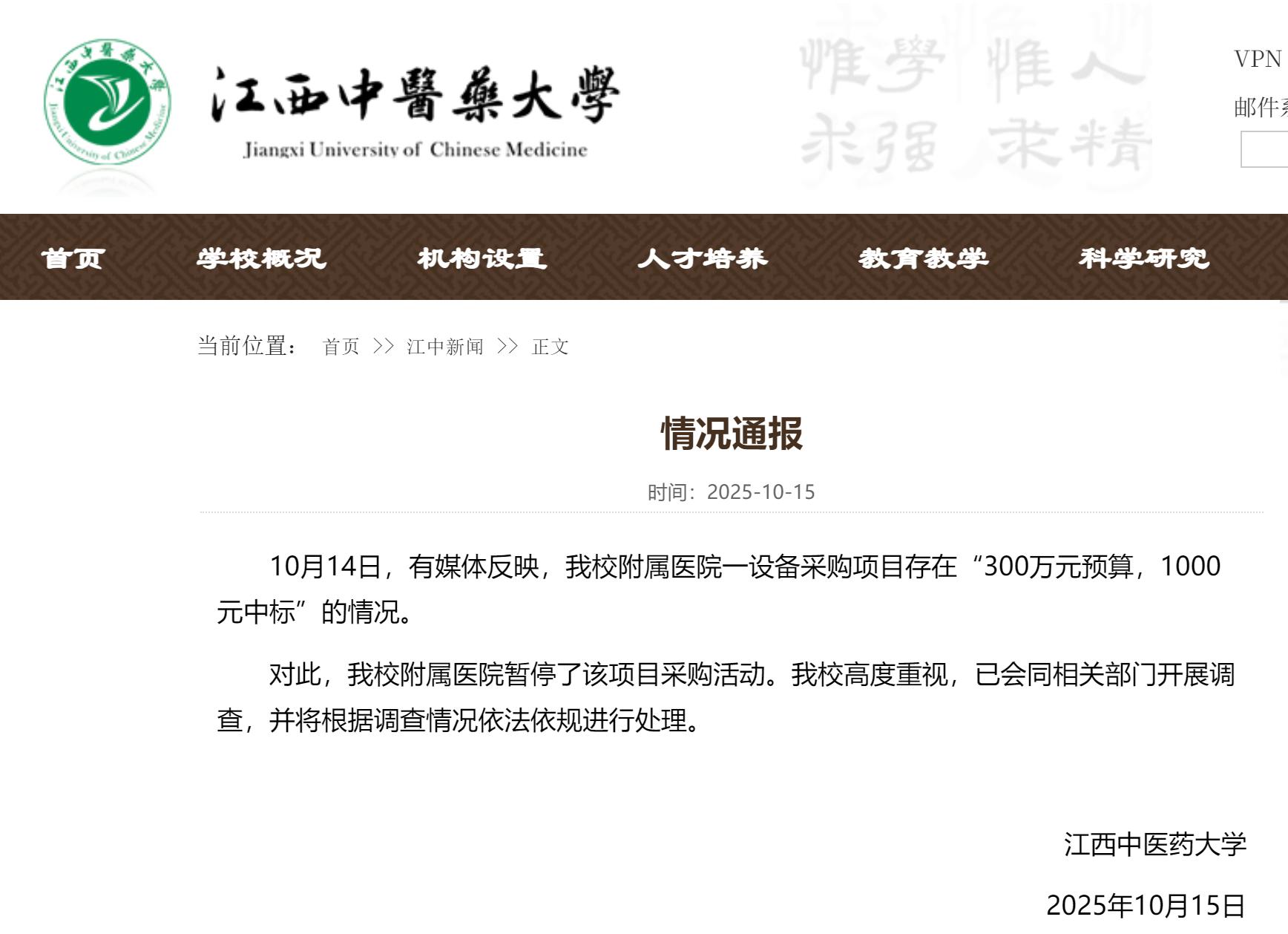 10月15日,江西中医药大学发布情况通报称,10月14日,有媒体反映,我校附属医院一设备采购项目存在“300万元预算,1000元中标”的情况。对此,我校附属医院暂停了该项目采购活动。我校高度重视,已会同相关部门开展调查,并将根据调查情况依法依规进行处理。