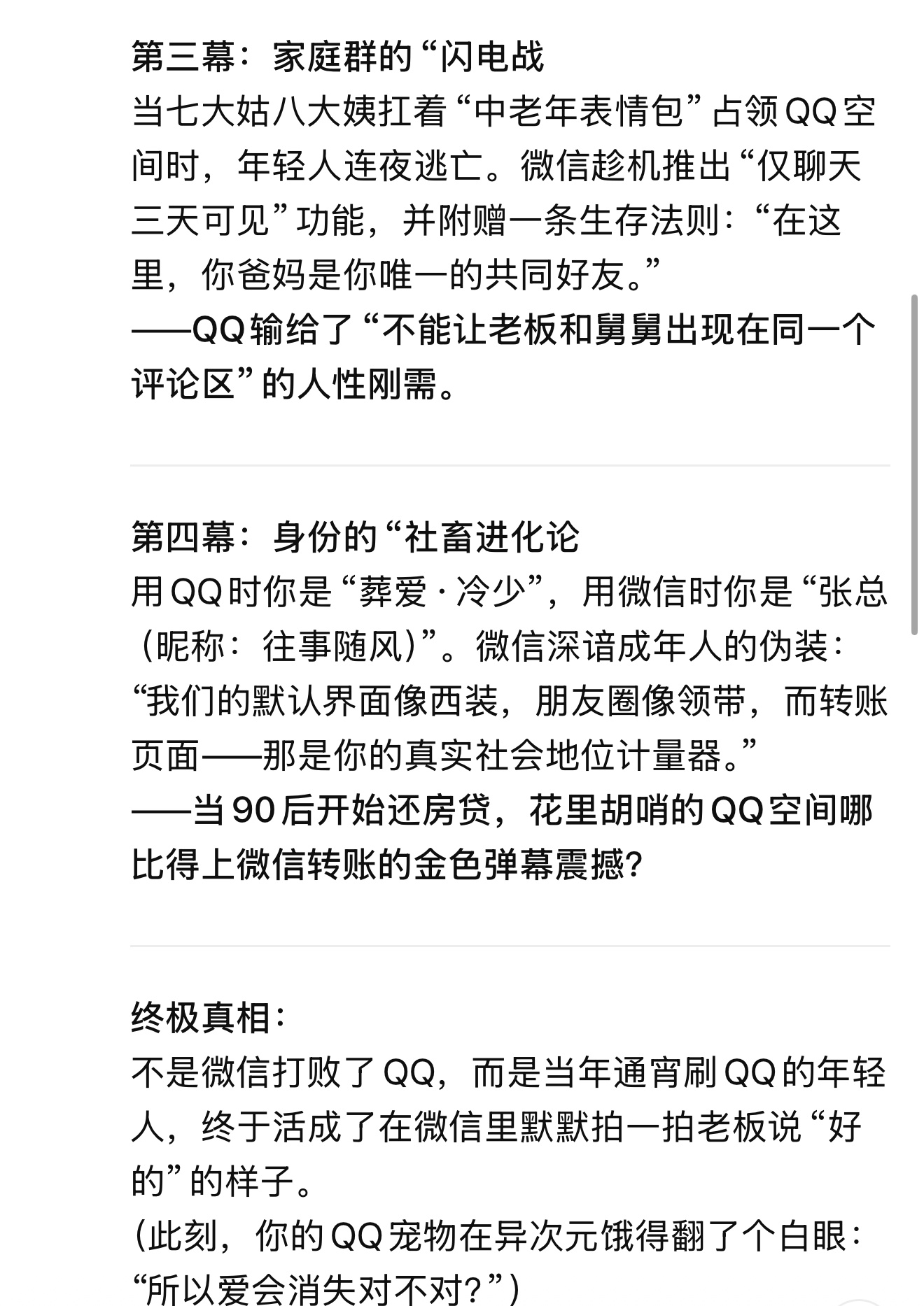 那批玩QQ的年轻人长大,步入职场和社会,他们需要一个更简洁、更能服务于现实生活和工作的工具。QQ也并未消失,它依然是年轻一代(尤其是00后)的线上乐园。
