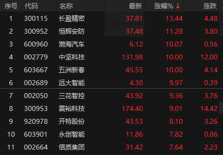 上证报中国证券网讯10月15日午后,机器人概念股震荡走强,截至13时27分,中坚科技、五洲新春涨停,长盈精密、恒辉安防涨逾10%,三花智控、震裕科技等跟涨。渤海汽车、远大智能此前封板。