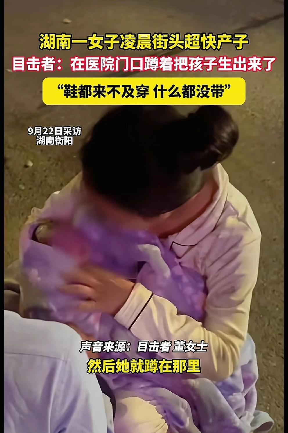 她该有多痛!又是何等坚强!” 9月22日凌晨,湖南衡阳街头,一位产妇在赶往医院途中竟当街分娩!赤脚蹲在刺骨寒风中,脐带还未剪断,她却用颤抖的双手紧紧抱住浑身赤裸的新生儿..... 那天凌晨的街头,冷风飕飕,几乎没什么人。董女士路过时简直不敢相信自己的眼睛。 一位年轻妈妈半蹲在路旁,脸色发白、浑身发抖,孩子已经出生了,却连件包裹的衣物都没有,浑身赤裸躺在冰冷的水泥地上,脐带都还没剪。 她整个人像被钉在原地,动都不能动,唯一的动作就是用发抖的手臂紧紧搂住孩子。 都说女子本弱、为母则刚,那一刻她拼尽最后力气,也要给孩子一点温度。 家人也急得团团转,丈夫跟姐姐一边打电话叫救护车,一边冲到附近商店买来一床干净被子,轻手轻脚地把婴儿包裹起来。 那一刻,孩子的啼哭声、母亲急促的呼吸、夜晚的风声混杂在一起,安静却惊心。 事后才得知,他们家条件并不宽裕,产妇是想省下一笔住院费才拖到最后一刻出门,没想到孩子这么“心急”,半路就来了。 消息传开后,很多网友不理解:再省钱也不能这么冒险吧!出事了咋办? 但也有人暖心回应:别轻易评判,不是谁都有选择的权利。 “她是我见过最坚强的妈妈”,家人反应很快了,买了被子、叫了救护车,已经很不容易了。 这件事之所以让人印象深刻,不光是因为母亲的无畏和亲人的关心,更重要的是它照见了许许多多普通家庭的真实处境! 每一分钱都要花在刀刃上,哪怕是生育这样的大事。 看着这个新闻,我真心佩服这位妈妈的坚强,也心疼她所经历的一切。有时候不是人愿意冒险,而是现实让人没得选。 幸好最后母子平安,这才是最暖的结局。你说,哪个当妈的不想给孩子最好的开始呢?希望她们以后的日子,能少一点风雨,多一些阳光。 生命的重量,从来不在锦衣玉食间,而在那双赤脚站立寒风、却始终不肯放手的臂弯里。