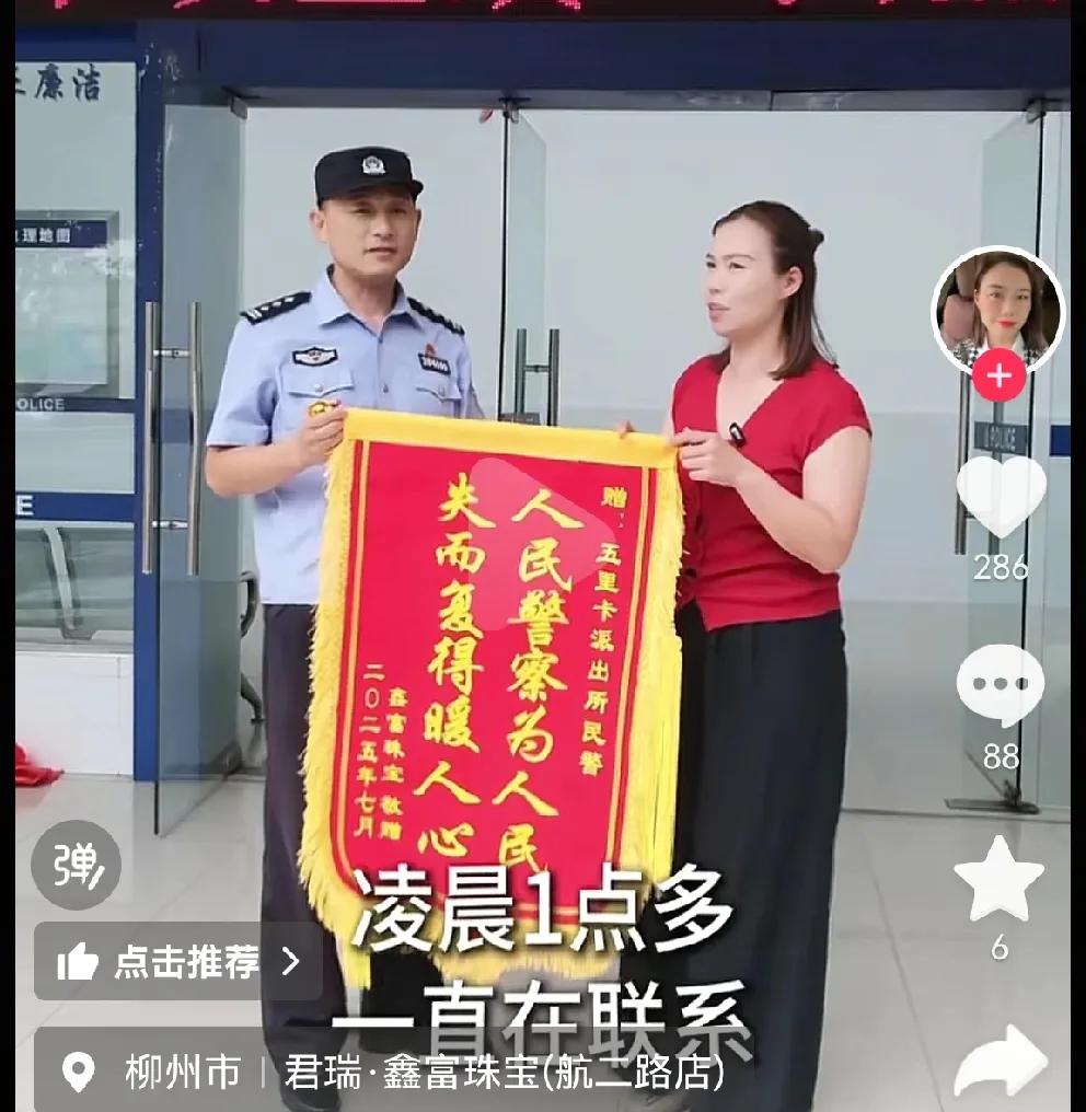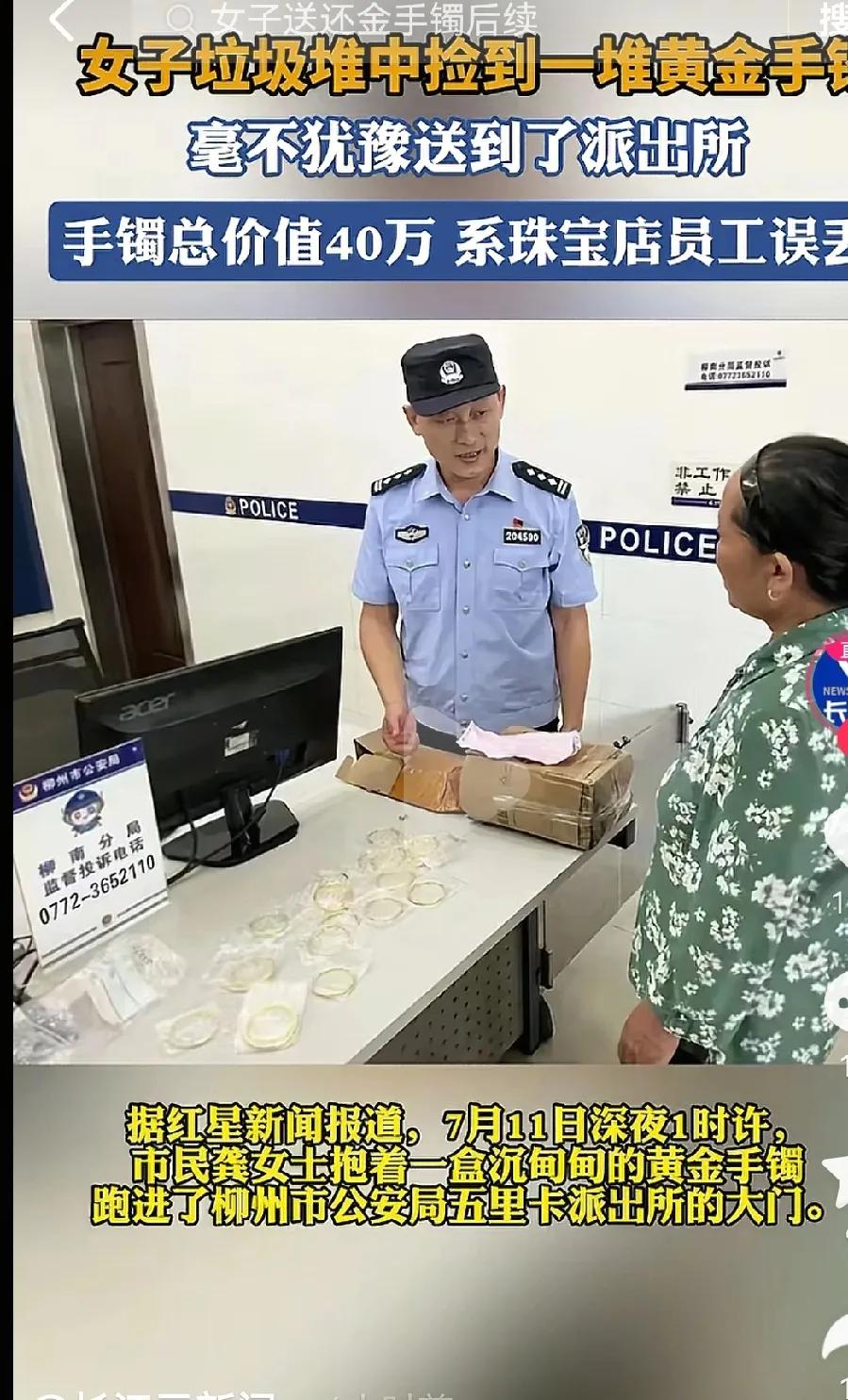 这真是太马虎了!广西柳州,48岁的龚女士结束工作,骑着电动车回家。途经珠宝店后巷时,她看到垃圾堆放点有个盒子。借着灯光一看,盒内有22只金手镯。 龚女士颤抖着手指拨通儿子电话:"儿子,妈捡到宝贝了。儿子一句话,点醒母亲。凌晨1点,母子俩决定立刻前往派出所。 值班民警回忆:"龚大姐抱着盒子冲进来时,手都在发抖。 金店店长,接到电话时正在外地。原来打烊前,员工丢纸壳,没注意误将黄金当作废料丢弃。 直到民警打电话,金店店长,才知道金子丢了。 7月12日下午,韦女士来到派出所在民警的见证下领回了丢失的金手镯。带着锦旗向民警和龚女士致谢,再三推辞后收下锦旗。 网友热议:见财不起意,是一份对他人的体谅与对良知的坚守。 面对意外之财,用最朴素的行动诠释着“君子爱财,取之有道”的真谛。 对于此事,你大家怎么看呢?