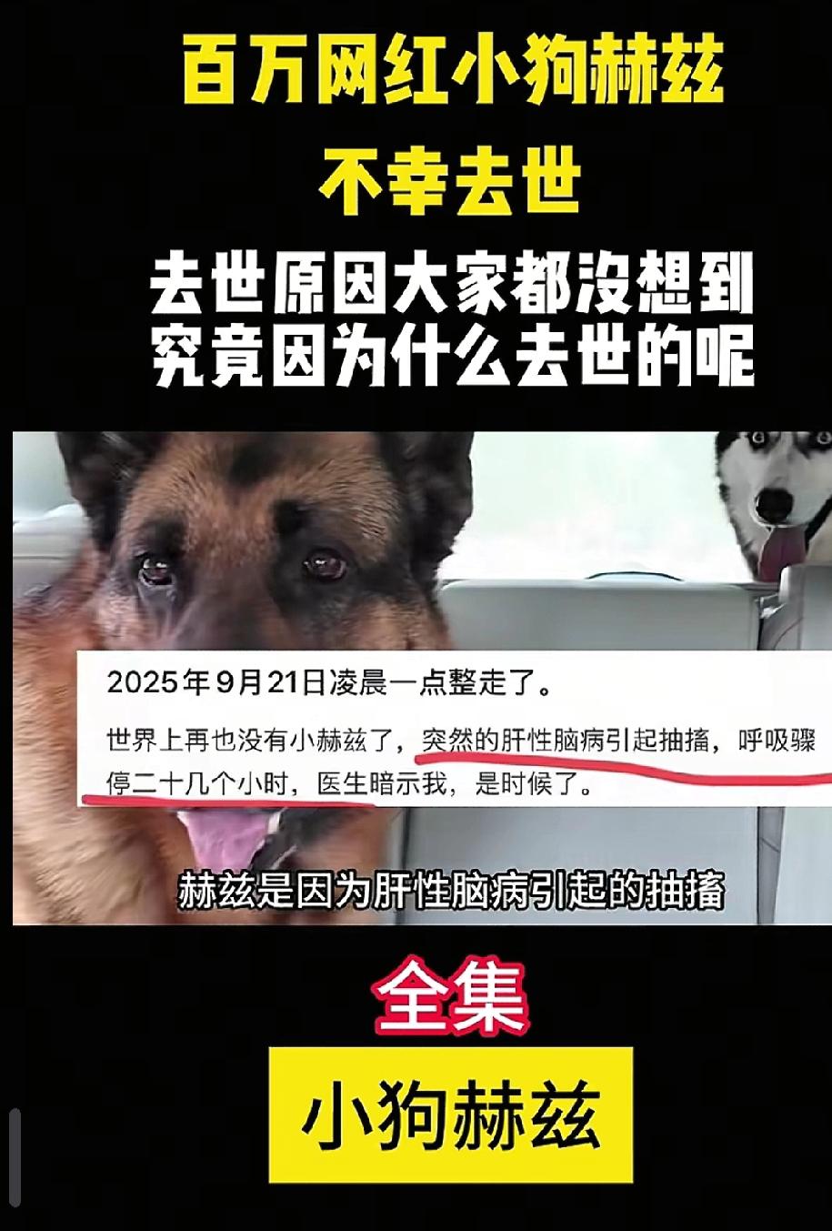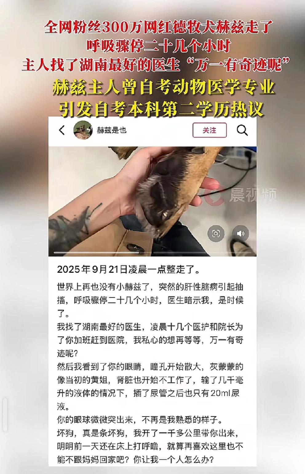 自学成才的兽医也没留住它! 9月21日凌晨1点,300万粉丝的德牧赫兹走了。前一天还在床上幸福打呼噜,几小时后却抽搐、呼吸骤停! 主人抱着它冲进抢救室,撕心裂肺求医生:“停了二十多小时,万一有奇迹呢?”你走了,谁陪我啊? 12岁的赫兹是全网最暖的“守护神”。视频里它总用脑袋轻蹭独居主人的手心,难过时默默趴在她脚边。 为照顾好这个“毛孩子”,主人啃下厚厚教材自考兽医专业,“它是我家人,我想亲手护它周全”。 20日晚,赫兹还蜷在主人被窝里打呼噜。几小时后却突然全身抽搐,诊断显示肝性脑病引发呼吸骤停。 主人疯了般驱车直奔湖南顶尖动物医院。凌晨手术灯亮如白昼,十几位医生轮番进行抢救,也没有成功救回来。 她盯着赫兹微微起伏的胸口,手指用力按压它的胸膛直到仪器报警,喃喃重复着:“撑住啊崽崽,妈妈在呢...” 抢救室外,千万网友彻夜刷屏。有人晒出赫兹帮主人擦泪的动图:“它治愈了多少人的孤独!” 也有人叹息:“狗生太短,12年不够啊...”可质疑声同样刺眼:“至于这么大阵仗?狗命比人金贵?”“作秀吧,兽医证哪这么好考?” 当心跳监测仪最终拉成一条冰冷的直线,主人把脸深深埋进赫兹颈间渐凉的毛发,身体剧烈颤抖着哽咽:“你走了...我一个人怎么办?” 她最后颤抖着亲吻了它总爱拱人的湿鼻子——就像过去四千多个清晨唤醒她的方式一样。 看到赫兹闭眼的瞬间,我忽然懂了:宠物用一生教我们两件事——无条件去爱,和练习告别。 它不会说话,却让我们学会对生命负责;它终将离开,却把“家”永远烙在我们心里。 今夜回家时,记得拍拍等你那团毛茸茸的小太阳——毕竟有些温暖,错过便是永远。 你家毛孩子,此刻正在家用什么姿势等你回家呢