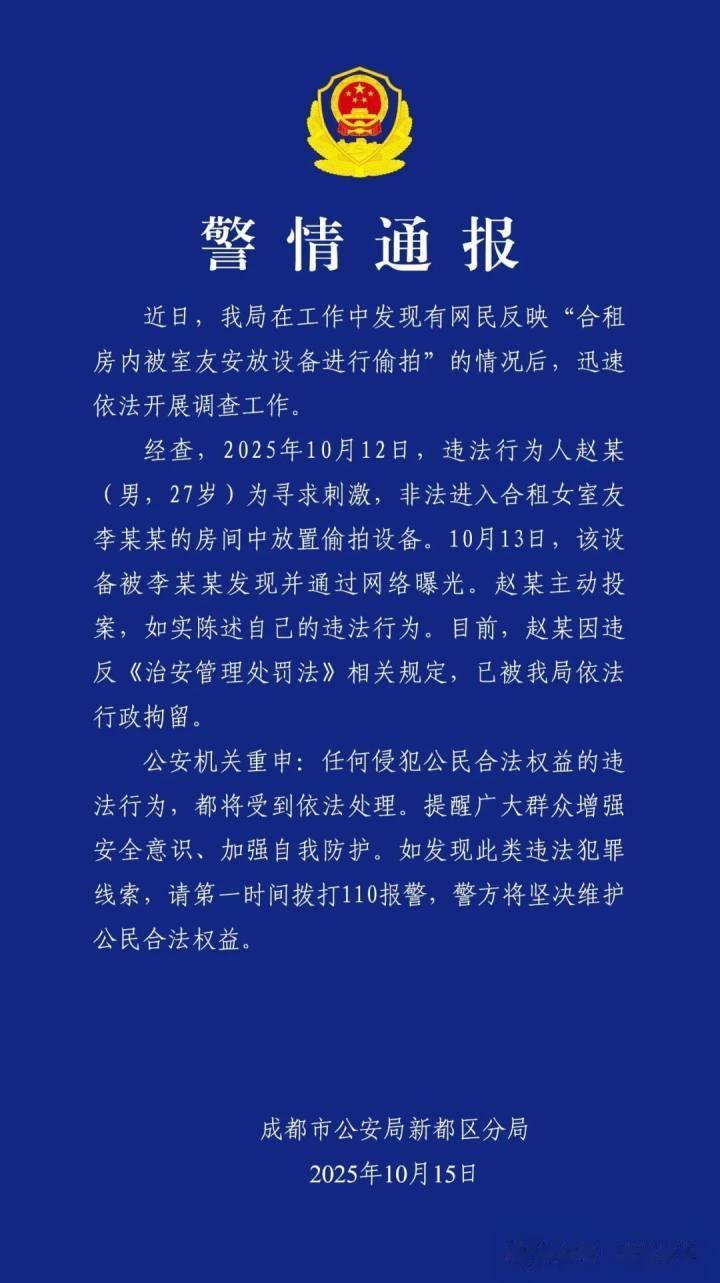 近日,我局在工作中发现有网民反映“合租房内被室友安放设备进行偷拍”的情况后,迅速依法开展调查工作。