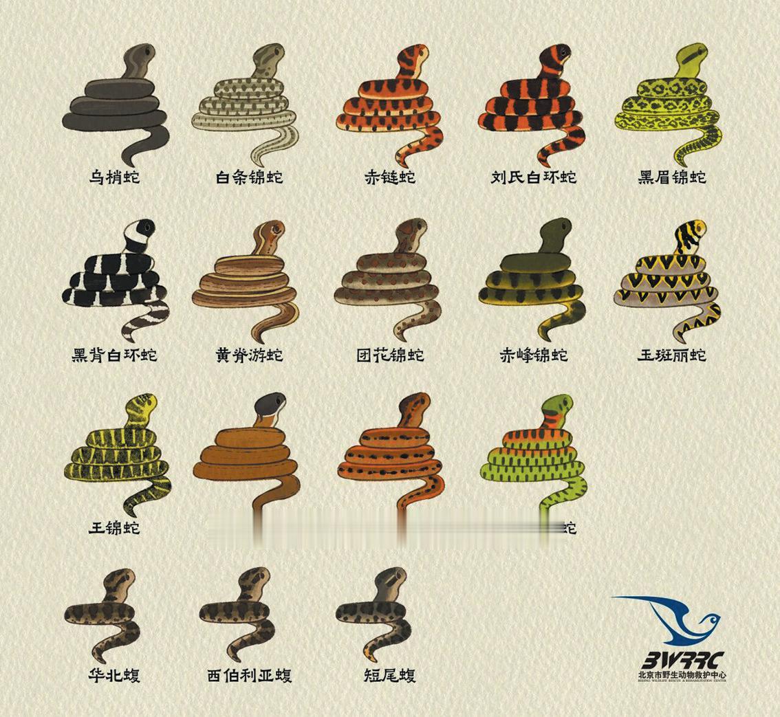 北京地区目前发现有17种蛇,其中13种不会致人严重伤害,可以称之为无毒蛇的蛇类(白条锦蛇、赤峰锦蛇、王锦蛇、团花锦蛇、黑眉锦蛇、玉斑丽蛇、红纹滞卵蛇、赤链蛇、黑背白环蛇、刘氏白环蛇、黑头剑蛇、黄脊游蛇、乌梢蛇),有3种是管牙蛇的毒蛇(短尾蝮、华北蝮、西伯利亚蝮),1种具有发达的达氏腺可以引发强烈出血的毒蛇(虎斑颈槽蛇)。