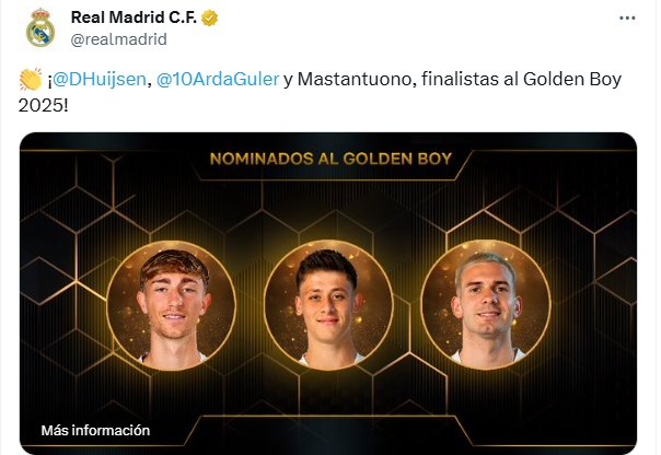 因与《法国足球》关系不佳,皇马此前并未在社媒或官网祝贺入选金球候选的球员,但这次他们在社媒和官网都祝贺了赫伊森、居莱尔和马斯坦托诺。