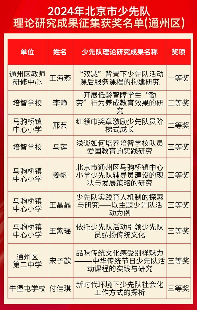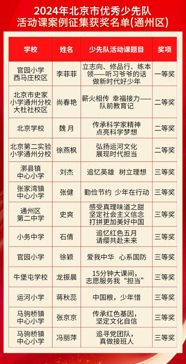 日前,2024年北京市少先队理论研究成果征集活动以及2024年北京市优秀少先队活动课案例征集活动,评选结果揭晓,通州区少先队工作再创佳绩,共有22名教师荣誉上榜。其中,一等奖2人、二等奖5人、三等奖15人。