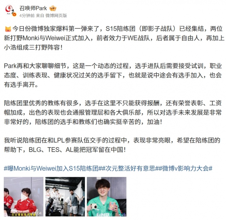 直播吧10月16日讯 今日爆料人表示,两位新打野Monki与Weiwei正式加入S15陪练团,和小浩组成三打野阵容,但为提及WBG。