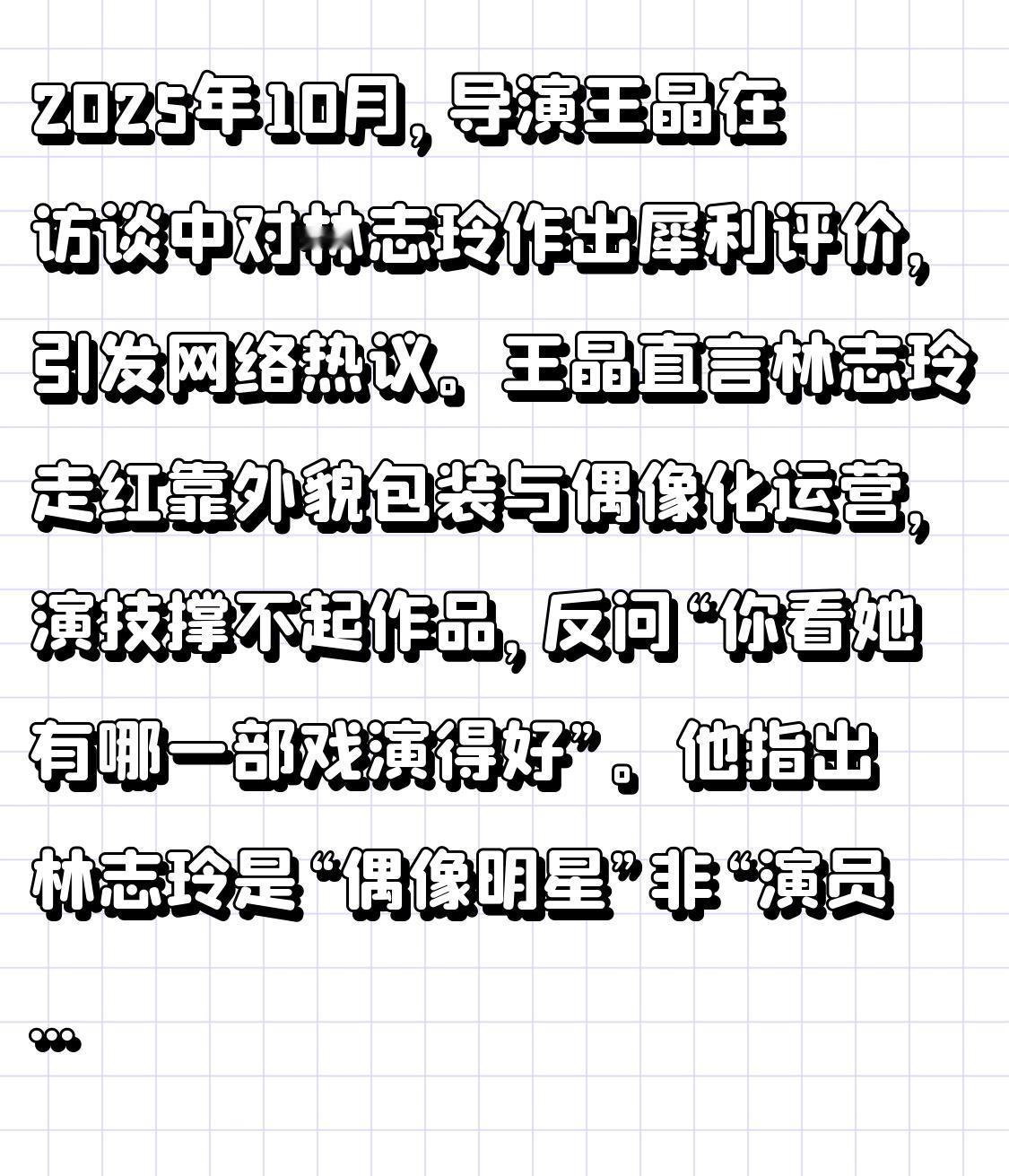 2025年10月,导演王晶在访谈中对林志玲作出犀利评价,引发网络热议。王晶直言林