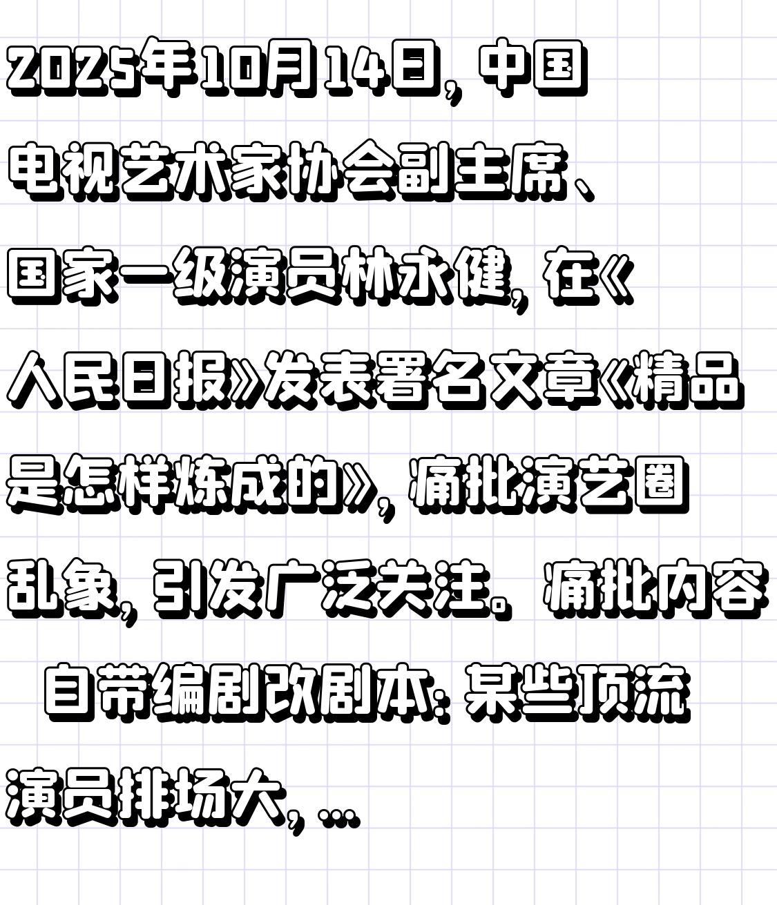 2025年10月14日,中国电视艺术家协会副主席、国家一级演员林永健,在《人民日报》发表署名文章《精品是怎样炼成的》,痛批演艺圈乱象,引发广泛关注。 痛批内容 ●自带编剧改剧本:某些顶流演员排场大,自带“编剧团队”进组随意改剧本,以“加戏份、保人设”为目的,破坏剧情逻辑,让作品沦为“明星定制款”。比如农村题材主角前一秒还在地里薅草,下一秒就改成“归国精英下乡体验”,只因“顶流不想灰头土脸”。 ●选角“唯流量论”:制片方选角只看粉丝量和招商能力,忽视角色匹配度、演技胜任度和艺德涵养度,导致“强行喂饭”,观众反感。 ●剧本脱离现实:很多剧被批“悬浮”,编剧在高星级酒店想象民间疾苦,创作脱离生活、民生和当下观众认同的价值观。 ●题材跟风爆款:题材选择上同质化严重,跟风爆款,忽略社会真实需求,导致观众审美疲劳。 事件影响 ●行业反思:文章在网络上掀起波澜,中国电视剧制作产业协会转发文章并指出“演员自带编剧随意改剧本”是2025年行业四大乱象之一,呼吁制作方重视。 ●网友猜测:网友纷纷猜测“顶流”是谁,与林永健合作过的成毅、杨幂、赵丽颖、肖战等演员“躺枪”,但相关质疑都被澄清或缺乏证据。林永健经纪团队称文章只谈现象,不针对个人。
