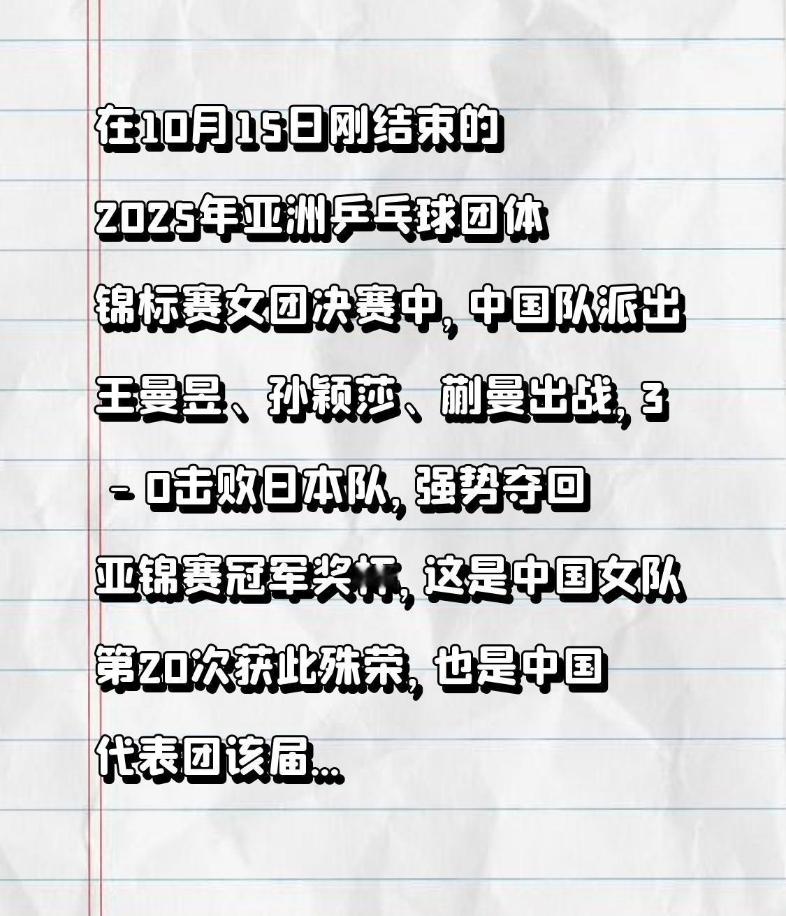 在10月15日刚结束的2025年亚洲乒乓球团体锦标赛女团决赛中,中国队派出王曼昱、孙颖莎、蒯曼出战,3 - 0击败日本队,强势夺回亚锦赛冠军奖杯,这是中国女队第20次获此殊荣,也是中国代表团该届赛事首金,同时获得2026年伦敦世乒赛参赛资格。 比赛过程 ●首盘王曼昱逆转:王曼昱对阵桥本帆乃香,首局10 - 12惜败后调整战术,以11 - 3、11 - 6、11 - 3连扳三局。 ●次盘孙颖莎速胜:孙颖莎迎战张本美和,以11 - 9、11 - 5、11 - 7连赢三局,实现对对手的“双杀”。 ●决胜盘蒯曼逆转:蒯曼对战早田希娜,首局8 - 11落后,随后以12 - 10、11 - 6、11 - 9连扳三局。 胜利原因 ●针对性训练:王曼昱有“反手压制 + 落点控制”训练体系;孙颖莎经历“三段式干扰 + AI预判”特训;蒯曼接受“极限体能 + 战术灵活性”训练。 ●科技助力:邱贻可引入VR复盘系统,王皓用AI动作捕捉技术分析队员技术动作。 ●团队协作:教练及时调整战术,队员间相互支持鼓励。 胜利意义 ●保持优势:巩固中国女乒在亚洲的领先地位。 ●增添信心:为洛杉矶奥运周期注入信心。 ●商业价值提升:福布斯数据显示,夺冠当晚孙颖莎个人品牌估值涨至1.2亿元,全队商业代言总额比去年涨40%。 ●培养新人:中国乒协成立“青年教练组”,王曼昱、蒯曼兼任导师,教学片版权销售助力基层训练。王曼昱蒯曼 女乒亚锦赛 亚洲乒乒锦标赛 国乒女团亚锦赛 孙颖莎蒯曼 蒯曼王曼昱 蒯曼女单冠军