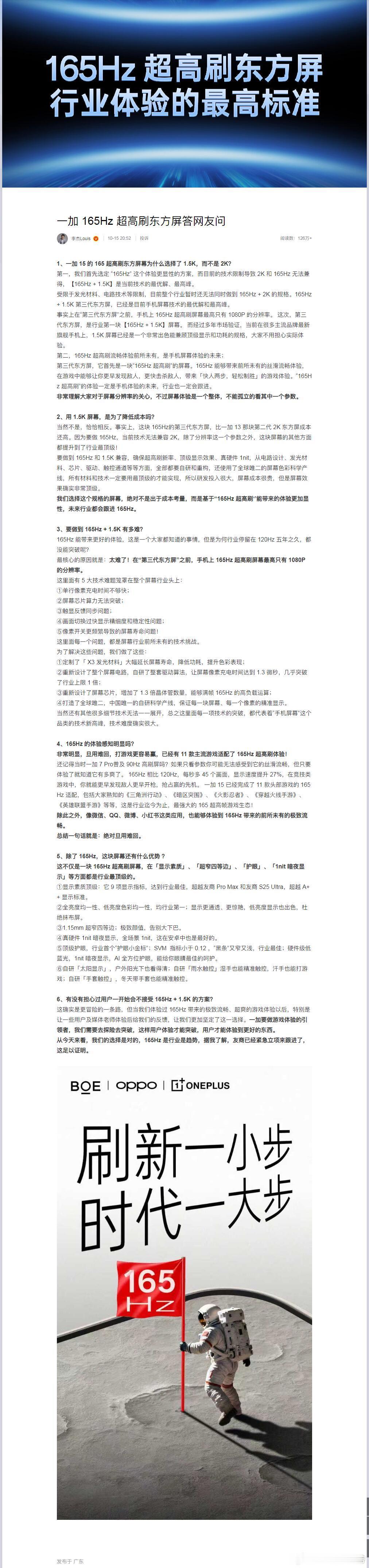 一加李杰称,一加15用1.5K屏幕,不是为了降低成本,而是先选定165Hz方案,