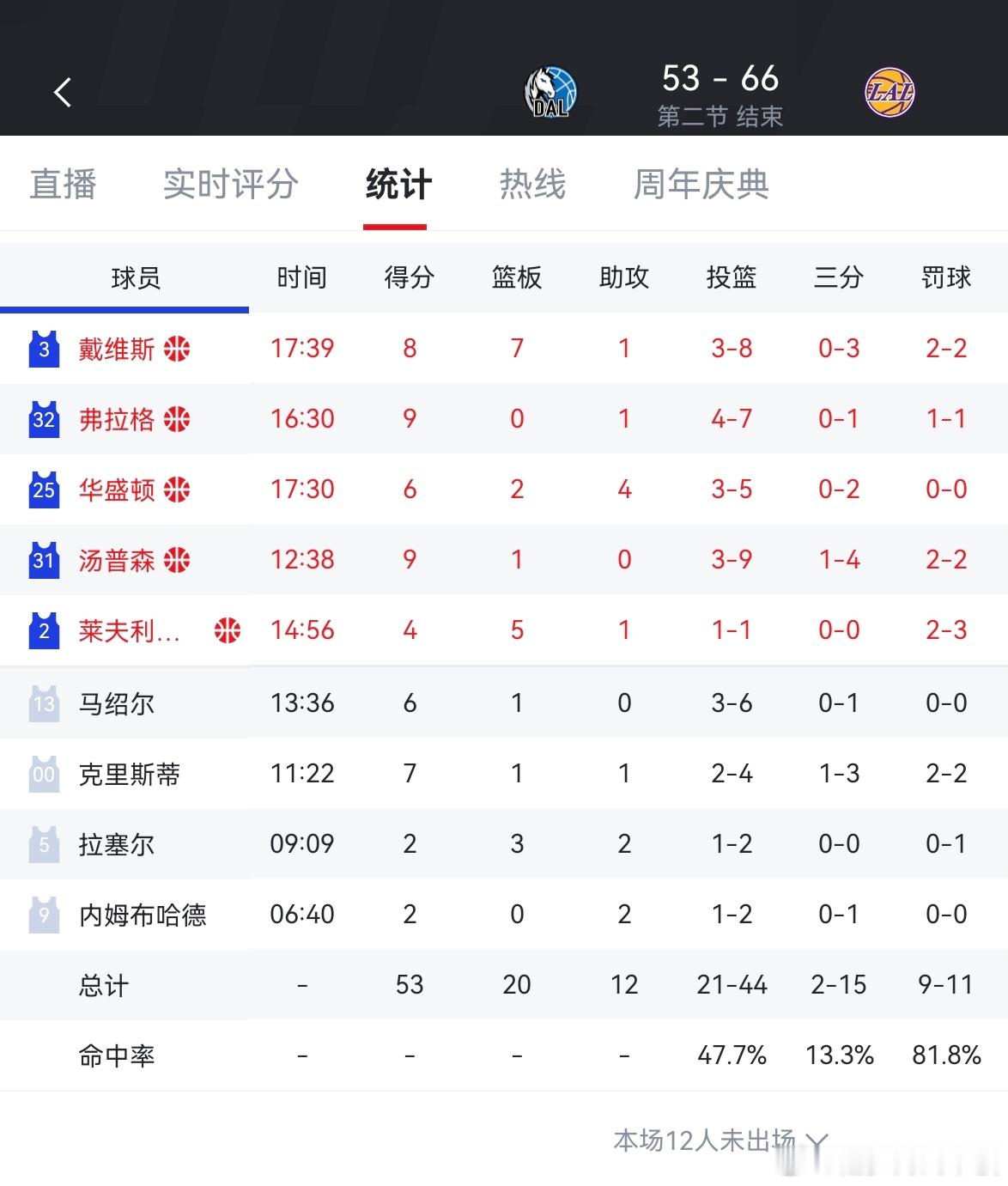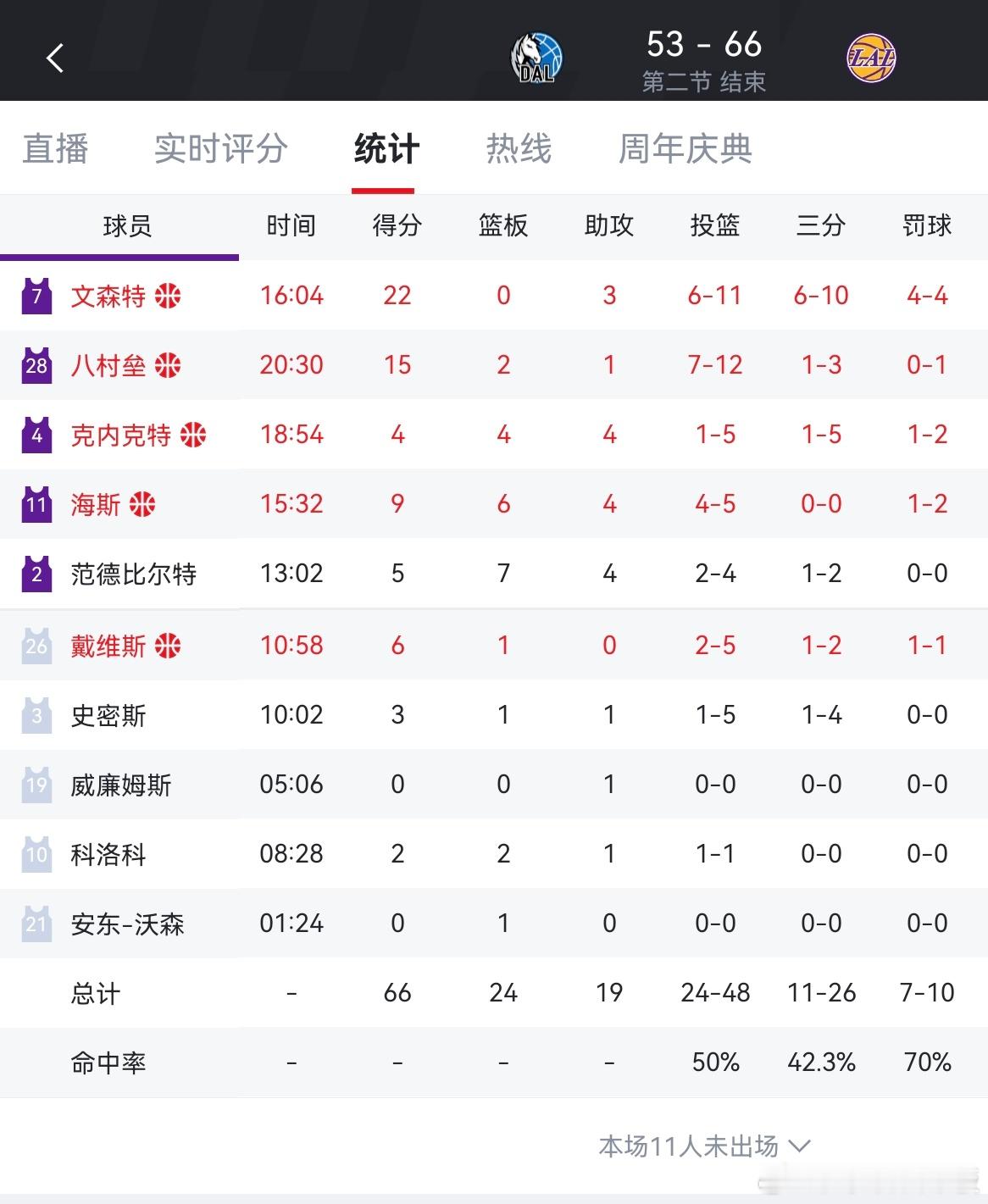 半场湖人66-53独行侠,怎么说?文森特22分,八村垒15分,浓眉8分7板