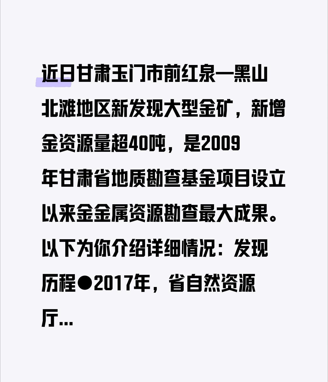 近日甘肃玉门市前红泉—黑山北滩地区新发现大型金矿,新增金资源量超40吨,是2009年甘肃省地质勘查基金项目设立以来金金属资源勘查最大成果。以下为你介绍详细情况: 发现历程 ●2017年,省自然资源厅部署“甘肃省玉门市前红泉—黑山北滩地区1∶5万矿产远景调查”项目。省地矿局四勘院经分析认为前红泉金矿找矿潜力大。 ●2018年,针对AS - 3综合异常查证时发现前红泉金矿点。 ●2019 - 2020年,将矿化带追索扩大至10公里以上,圈定多条工业品位金矿体。同年,“甘肃省玉门市前红泉金矿普查”项目实施。 ●2021年,省地矿局四勘院申请扩大勘查区面积,前红泉金矿勘查增储大会战主战场确立。 金矿情况 此次发现的金矿是在基础地质调查上,通过大比例尺化探手段逐步勘查而来。最终探明金矿化带长达14公里、宽10 - 100米,新增金资源量超40吨,相当于两个标准大型金矿规模。按近1150元/克金价算,40吨黄金价值约46亿元。且这是“资源量”,后续通过技术优化,实际可采黄金可能增加。 重要意义 ●对玉门而言:直接带动就业,金矿开采等环节预计创造上千岗位;拉动产业链,吸引配套企业入驻,带动服务业发展,形成“一矿带一片”效应。 ●对甘肃而言:是找矿“风向标”。甘肃北山地区是重要成矿带,但之前勘探程度低,此次发现证明北山南带韧性剪切带周边找矿潜力大,为后续找矿提供方向,如用大比例尺化探结合钻探法或发现更多金矿。砂河金矿 玉门钻井 金萡矿 白银铅锌矿 玉门金矿 武威黑山石矿石 三处金矿