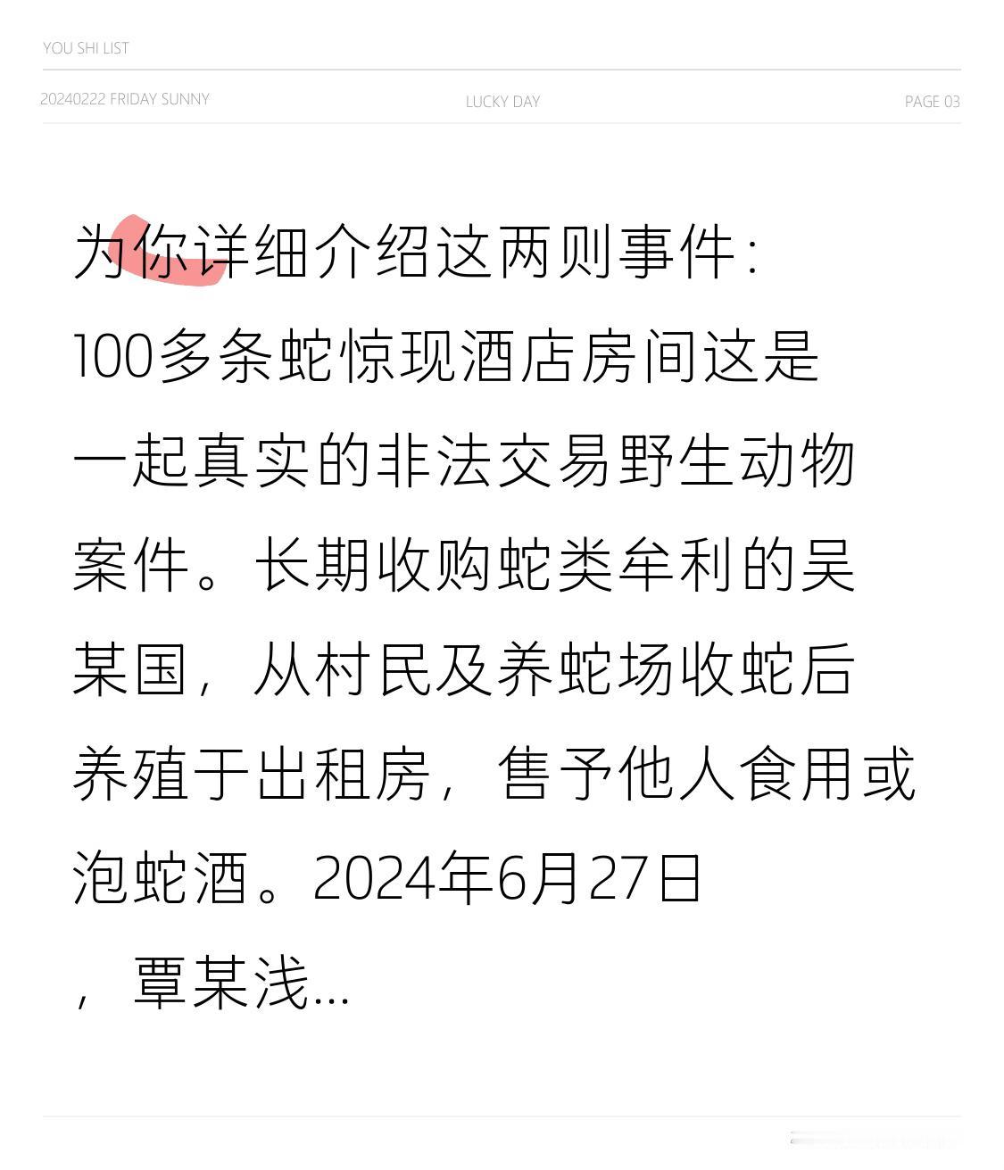 为你详细介绍这两则事件: 100多条蛇惊现酒店房间 这是一起真实的非法交易野生动物案件。长期收购蛇类牟利的吴某国,从村民及养蛇场收蛇后养殖于出租房,售予他人食用或泡蛇酒。2024年6月27日,覃某浅向吴某国批量采购蛇类,吴某国额外赠予若干小蛇。7月3日,覃某浅携带两大袋蛇入住河池市金城江区某酒店,告知工作人员无需打扫且禁止入内。7月6日,公安机关接到举报,在某市场路口抓获正在售蛇的覃某浅,现场查获蛇类54条(死体5条),并在其酒店房间查获75条。7月7日,民警在吴某国出租房查获74条蛇。 经鉴定,从覃某浅处查获129条蛇类(含1条国家二级保护动物三索蛇),价值53,900元;从吴某国处查获74条蛇类(含7条国家二级保护动物眼镜王蛇),价值69,800元。法院审理认定,吴某国构成危害珍贵、濒危野生动物罪及非法收购、出售陆生野生动物罪;覃某浅构成非法收购、出售陆生野生动物罪,二人分别被判处相应刑罚。 NBA篮网队宣布裁掉曾凡博 北京时间10月15日深夜,曾凡博工作室确认NBA篮网队已裁掉曾凡博。此前篮网与曾凡博签的是保障性最低的Exhibit 10合同。在季前赛和两场NBA中国赛里,他仅获得一次出场机会,10分06秒出场时间里无进攻出手,只有1次抢断、3次犯规,被裁并不意外。 今年夏天曾凡博再度冲击NBA,上赛季CBA他有进步,但季后赛腰部骨折重伤影响了后续计划。受伤恢复后,他前往美国特训,后参加篮网训练营。美国媒体曾认为他是篮网最后一个双向合同名额有力竞争者,但他在比赛中的表现未打动教练组。 接下来曾凡博将前往美国恢复身体再规划未来。因CBA新赛季12月开打,他还有时间寻找海外高水平联赛机会,NBA发展联盟是选择之一,他三年前曾在此打过一个赛季;他也可回归CBA,北汽男篮已为他完成预注册。景区的蛇 毒蛇事故 广西蛇出没 蛇类自然奥秘 广西蛇 广西梧州古龙蛇 人蛇案
