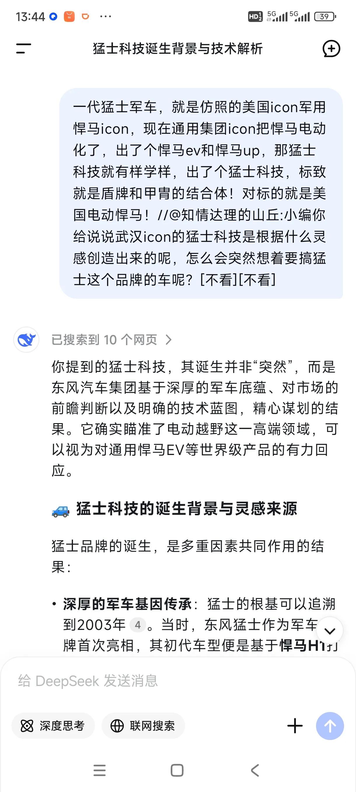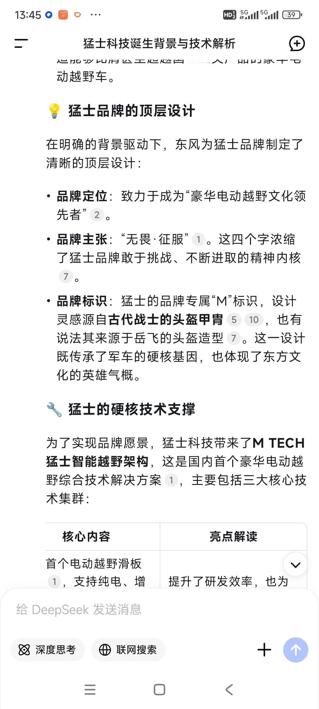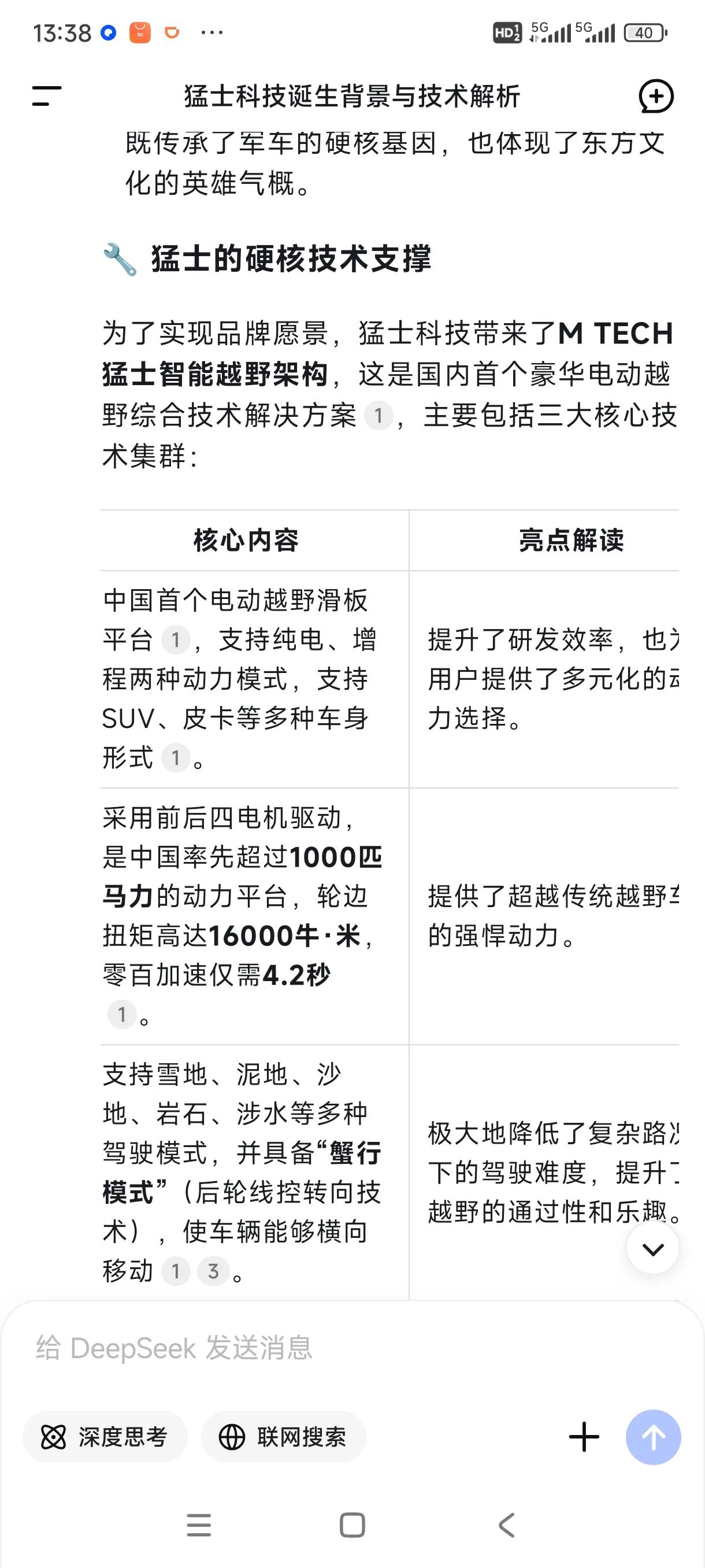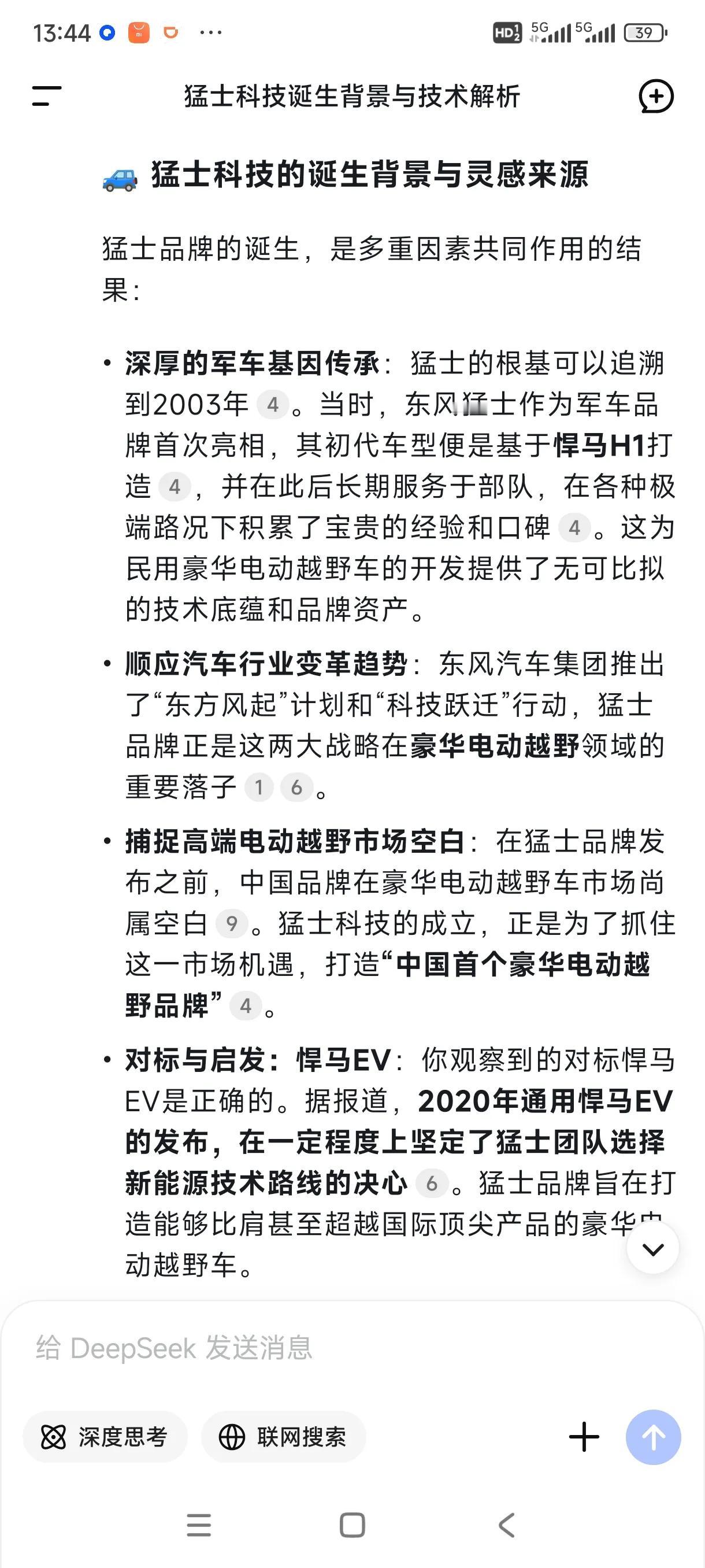 东风反哺合资早已不是新鲜事,但是反哺外资品牌于国际市场还是很期待的。相当于技术出口,有了他们猛士的研发费用肯定被摊薄了,甚至高速盈利。 如果国人支持度被某些民营资本挟持,猛士开启国外市场技术出口也是不错的。 近日网传JEEP即将搭载猛士技术,中国首家电动硬派越野就是猛士科技,他比南方某车企和北方某车企的首款电动越野都要先上市。 那么为何东风突发奇想要搞电动越野猛士呢? 猛士品牌的诞生,是多重因素共同作用的结果。深厚的军车基因传承,猛士的根基可以追溯到2003年。当时,东风猛士作为军车品牌首次亮相,其初代车型便是基于悍马H1打造,并在此后长期服务于部队,在各种极端路况下积累了宝贵的经验和口碑,多项技术早已超越悍马。这为民用豪华电动越野车的开发提供了无可比拟的技术底蕴和品牌资产。 顺应汽车行业变革趋势,东风汽车集团推出了“东方风起”计划和“科技跃迁”行动,猛士品牌正是这两大战略在豪华电动越野领域的重要落子。 捕捉高端电动越野市场空白,在猛士品牌发布之前,中国品牌在豪华电动越野车市场尚属空白。 猛士科技的成立,正是为了抓住这一市场机遇,打造“中国首个豪华电动越野品牌”。 对标与启发,悍马EV。据报道,2020年通用悍马EV的发布,在一定程度上坚定了猛士团队选择新能源技术路线的决心。猛士品牌旨在打造能够比肩甚至超越国际顶尖产品的豪华电动越野车。 虽然悍马燃油车早已经停产,但是通过又开始搞电动悍马,那么电动悍马,在猛士面前有优势吗? 猛士滑板越野平台MORA,中国首个电动越野滑板平台,支持纯电、增程两种动力模式,支持SUV、皮卡等多种车身形式。 提升了研发效率,也为用户提供了多元化的动力选择。 猛士动力MEGA POWER采用前后四电机驱动,是中国率先超过1000匹马力的动力平台,轮边扭矩高达16000牛·米,零百加速仅需4.2秒。 |提供了超越传统越野车的强悍动力。 猛士越野全地形智能解决方案M ATS,支持雪地、泥地、沙地、岩石、涉水等多种驾驶模式,并具备“蟹行模式”(后轮线控转向技术),使车辆能够横向移动。 极大地降低了复杂路况下的驾驶难度,提升了越野的通过性和乐趣。 |