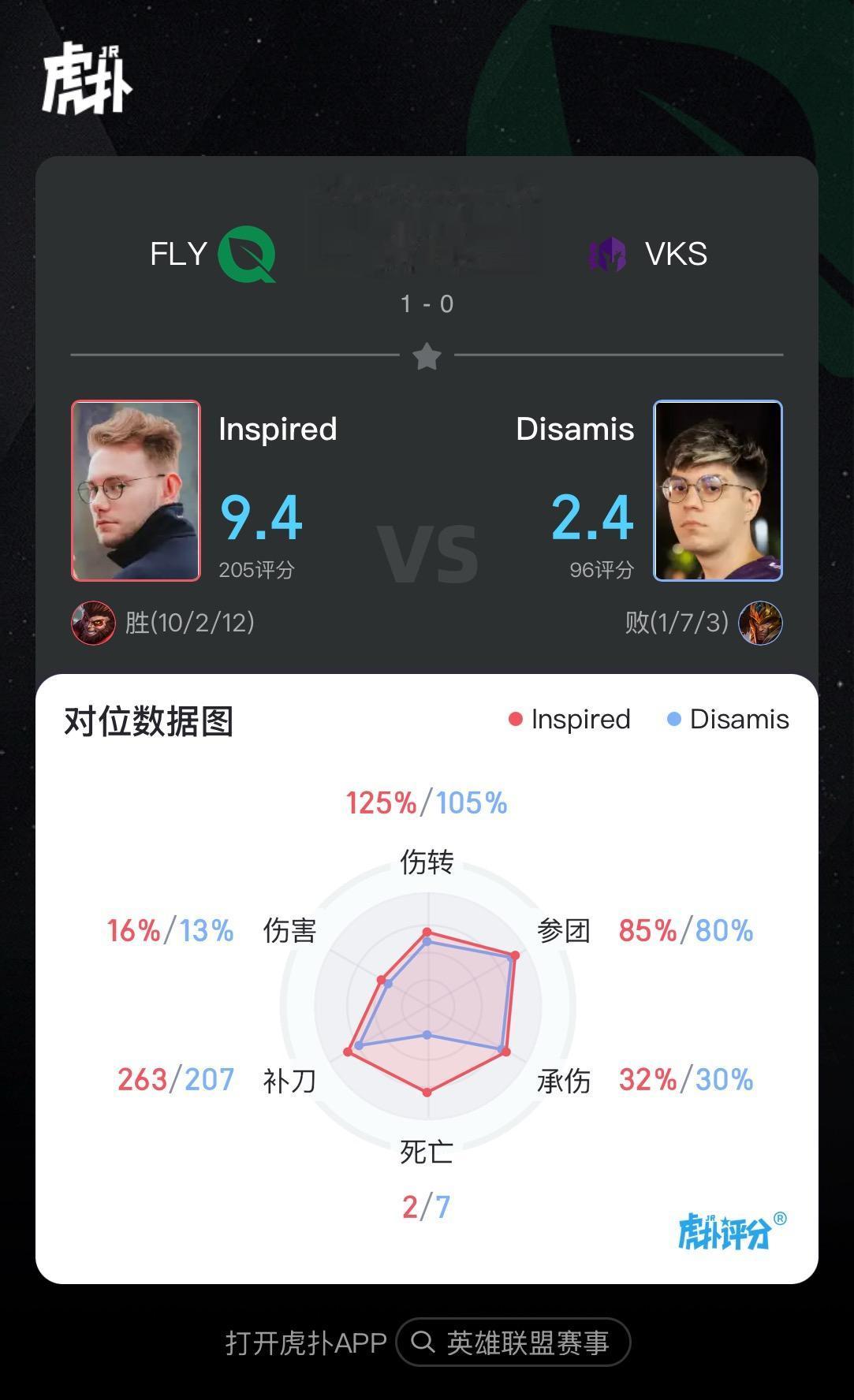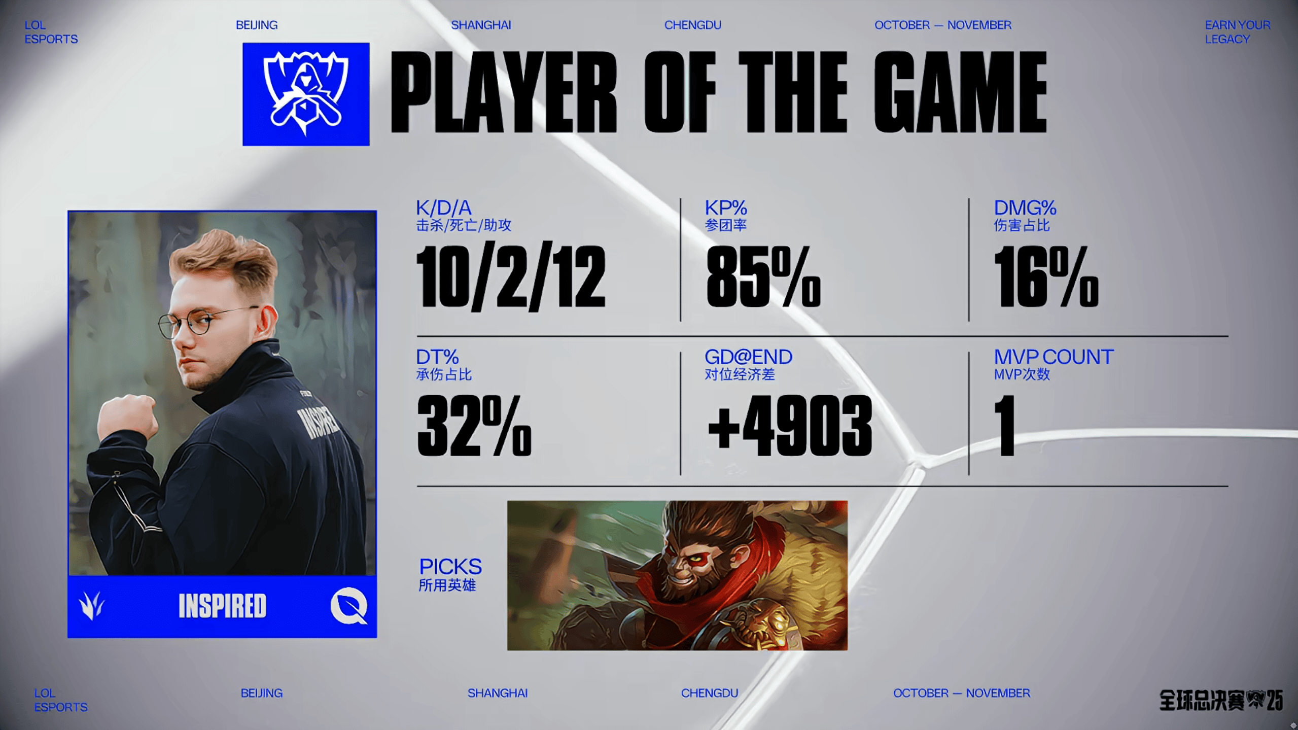 虎扑10月16日讯在刚刚结束的S15世界赛瑞士轮FLY对阵VKS比赛中,Inspired猴子打出10/2/12战绩,拿下FLY对阵VKS对局MVP,这是他第1个MVP。