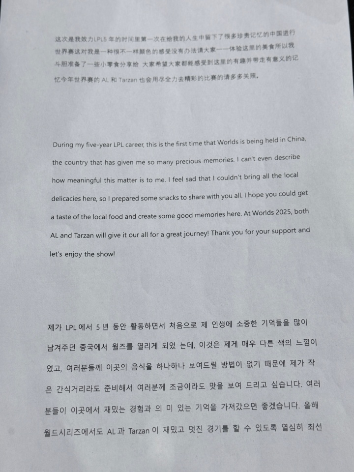 直播吧10月16日讯 今日媒体人王玮晨报道,AL打野Tarzan在S15瑞士轮期间,为媒体朋友准备诸多零食,并且用中英韩三种文字留言:来LPL五年中国的S赛对我是不一样的感觉,没有办法请大家一一体验中国美食,斗胆分享一些小零食。