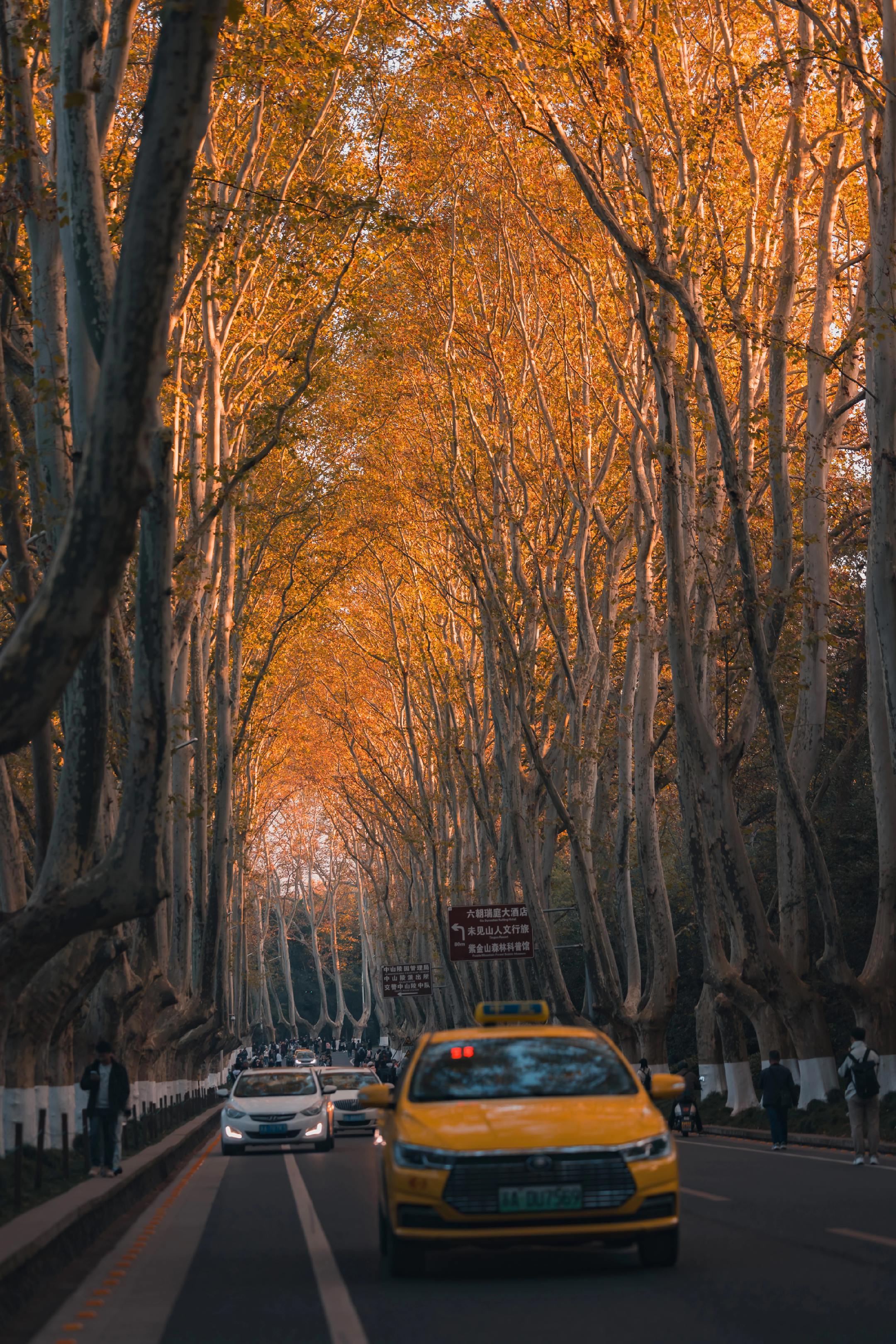 “一句梧桐美,种满南京城”的具象化!前往明孝陵的5号门必经之路,参天梧桐交织成金色拱廊,阳光透过树叶洒下斑驳光晕,电影感拉满。
