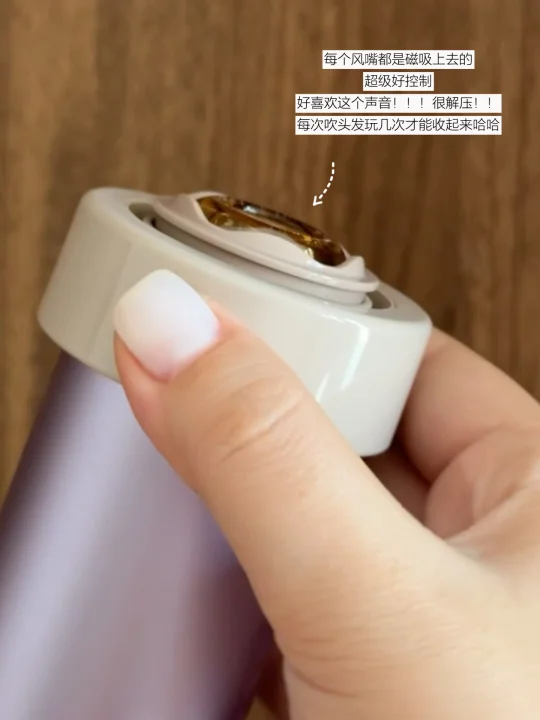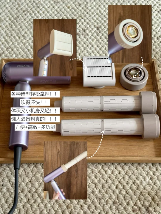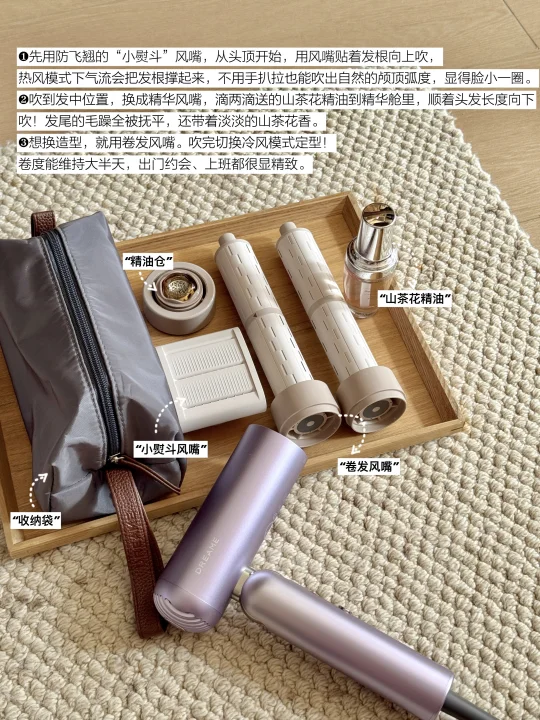 最让我惊喜的是它的精华风嘴!直接把护发精油变成细雾,吹头发的时候就顺便把营养吃进发丝里了~吸收得特好,还一点不油手;配套风嘴也很实用,气流自动把头发吸住卷,内扣外卷都能搞定,手再笨也不怕,还有个“小熨斗”风嘴,专治炸毛,懒人造型党狂喜!