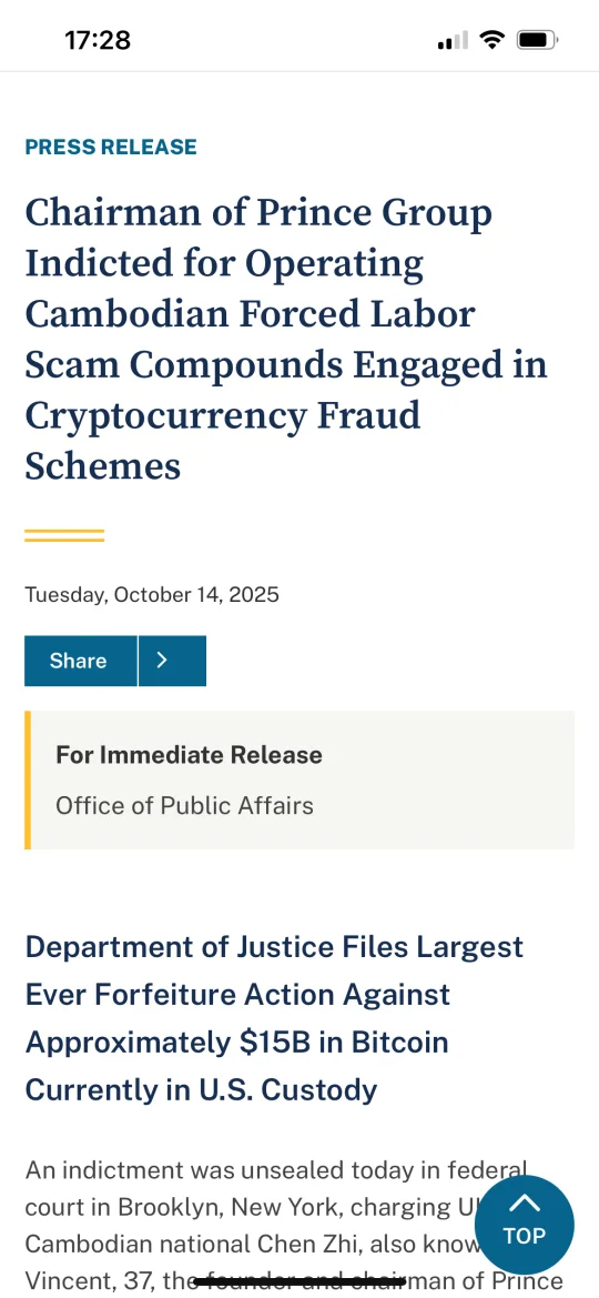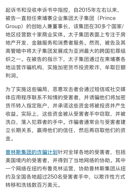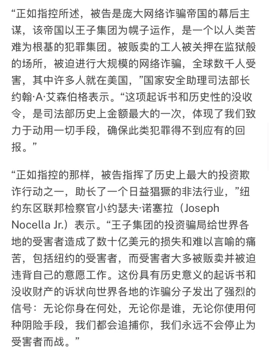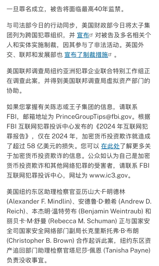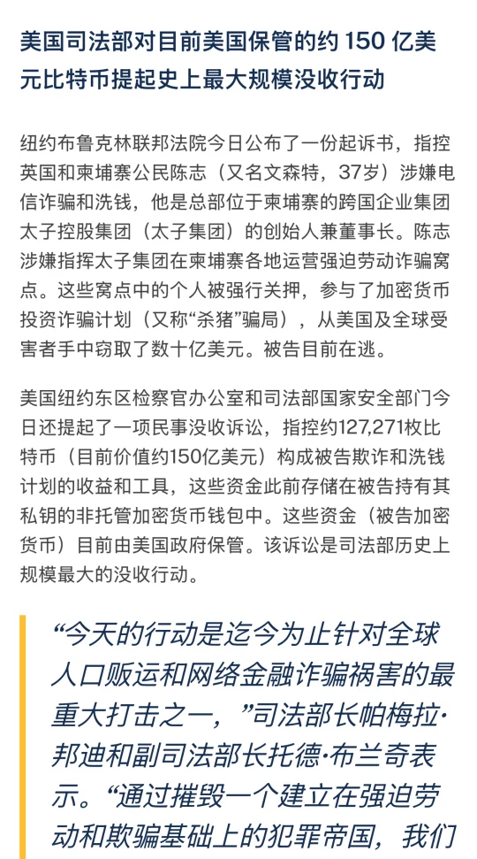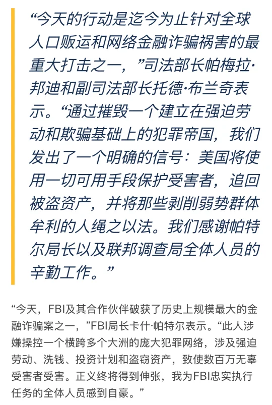一旦罪名成立,最高监禁达40年。同时对太子集团提起民事诉讼,要求没收其150亿比特币资产。 “今天的行动是迄今为止针对全球人口贩运和网络金融诈骗祸害的最重大打击之一,”司法部长帕梅拉·邦迪和副司法部长托德·布兰奇表示。“通过摧毁一个建立在强迫劳动和欺骗基础上的犯罪帝国,我们发出了一个明确的信号:美国将使用一切可用手段保护受害者,追回被盗资产,并将那些剥削弱势群体牟利的人绳之以法。”FBI破获了史上最大的金融诈骗案。
