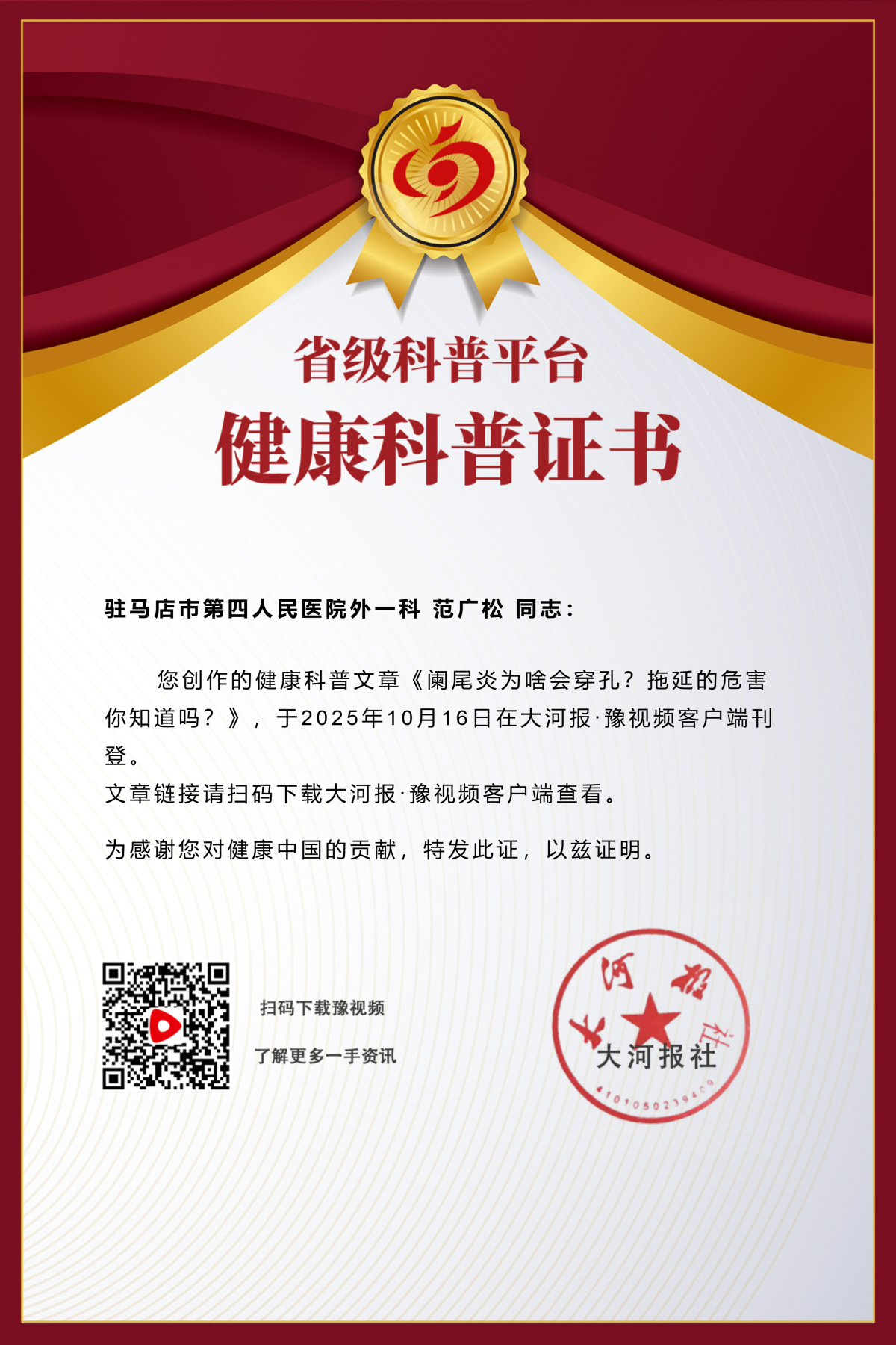总之,阑尾炎穿孔绝非“小毛病”,其发展过程如同多米诺骨牌,一个环节的延误都可能引发连锁反应。从管腔阻塞到细菌入侵,从局部坏死到全身感染,每个阶段都在敲响生命警钟。对于普通人群,出现转移性腹痛时应立即就医;对于高危人群,定期体检排查解剖异常至关重要。(驻马店市第四人民医院外一科范广松)