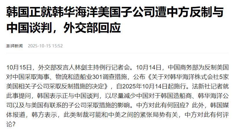 中美打架,韩国遭殃?韩国外交部10月14日发布声明,称将与中国进行沟通,以降低中国针对韩国造船巨头韩华海洋株式会社旗下美国相关子公司的反制措施所带来的影响。 但事实上,这几家韩企子公司之所以会被我们反制不是没有道理的。根据10月14日我商务部发布的公告显示,这些公司帮着美国政府,对中国的海事、物流还有造船行业搞不当调查,这已经实实在在损害到了中国的主权、安全和发展利益。 要知道,中国造船业在全球都是排得上号的,从大型货轮到特种船舶,整个产业链上牵扯着无数企业和工人的生计。 美国打着“调查”的幌子搞贸易保护,就是想遏制中国相关产业的发展,而韩华海洋的这些美国子公司主动凑上去帮忙,那自然要为自己的行为负责。 必须要说清楚的事,中国制裁的只是那些犯了错的美国子公司,并不是针对韩国本土的企业,更不是要打击整个韩国产业。 而这次反制,其实也是对抗美国单边霸权的其中一步,就像之前面对其他国家不合理的贸易行为时一样,我们也都是按照法律和规矩来,不会平白无故针对第三方。韩国完全没必要觉得自己是“遭殃”,关键是要看清楚问题出在哪些企业身上。 韩国要想避免这种情况,办法很简单,就是管好自己的企业,别让它们参与损害中国利益的事。韩华海洋作为韩国的造船巨头,在国际上做生意这么多年,肯定知道要遵守国际规则和商业道德。它的美国子公司选择帮着美国搞单边制裁,本身就违反了公平贸易的原则。 而且中国市场对韩国企业来说真的很重要,单说造船业,中国不仅是韩国企业的重要合作伙伴,还有巨大的市场需求,很多韩国造船相关的设备、技术都能在中国找到合作机会。 维护好和中国的经贸关系,对韩国企业自身发展也是有好处的,这是双赢的事,没必要因为个别企业的错误选择影响整体。 只要韩国企业不再帮着美国搞单边霸权那一套,中韩之间的经贸合作就能继续顺顺利利地发展,反之则和现在的局面是一样的。 说到底,国际经贸往来的正道是合作共赢,要是总想靠着依附单边霸权来占便宜,甚至损害第三方的利益,到最后只会反过来坑了自己。