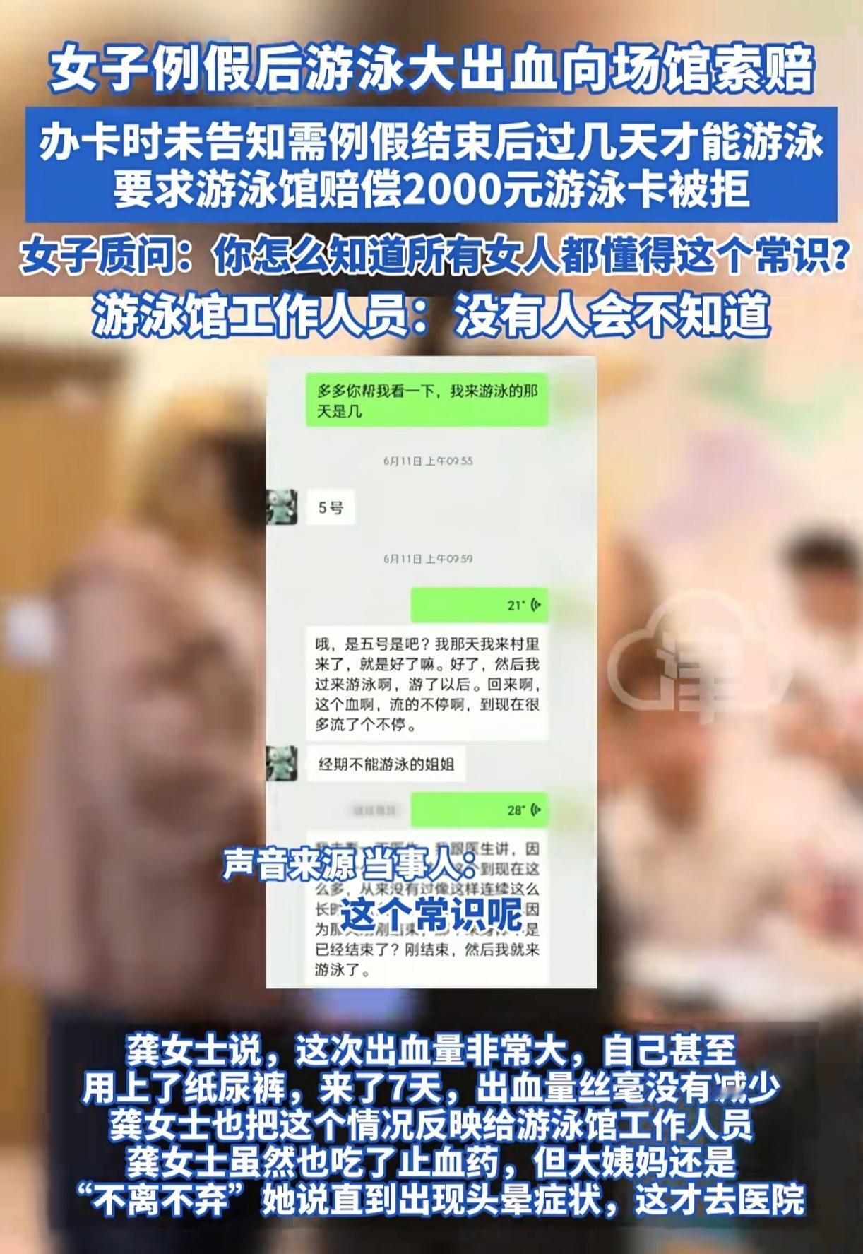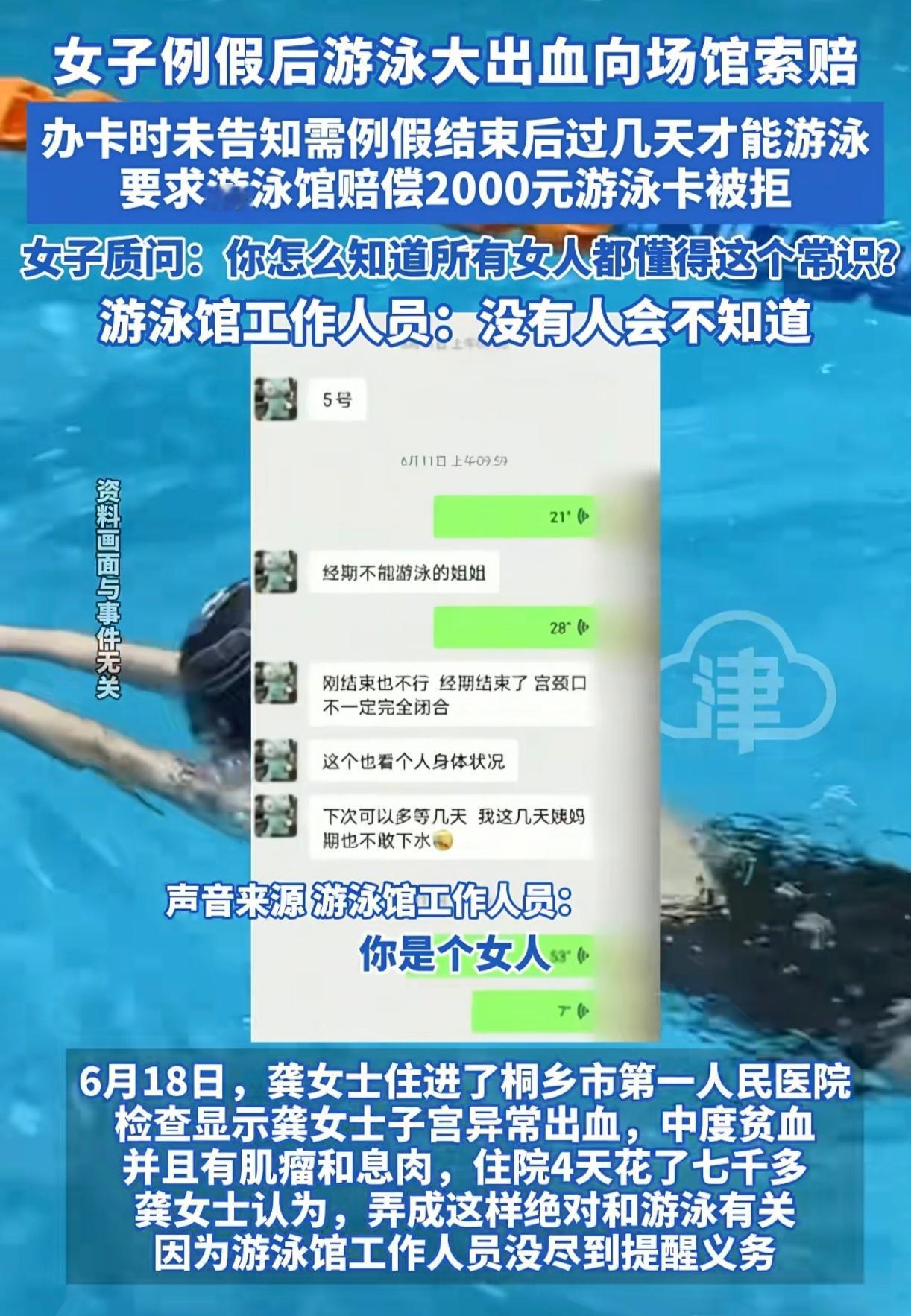 太离谱了!浙江桐乡一女子例假刚结束就去办卡学游泳,结果游完后当天夜里就大出血,一直止不住后去了医院做手术,4天花了7000多块,她把这事的责任怪在游泳馆头上,认为游泳馆没有尽到提醒义务,要求赔偿2000元的游泳卡。 但这一要求被游泳馆工作人员拒绝了,认为是常识问题。大家都是成年人了,女性来月经什么能做,什么不能做,自己应该非常清楚才对,不应该是让别人来提醒,所以这并不是工作人员的责任。 女子听完这话就不高兴了,反过来质问工作人员:你为什么这么确定所有女人都懂得这个常识? 事后,女子在与游泳馆协商未果后,就把事情曝光出来,向媒体求助,希望能帮她成功要到索赔。 这事在网上曝光后也引起网友的围观与热议! 有的网友好奇,按照女子的逻辑,要是她刚月经完,出去外面走一圈,然后大出血了,那她应该告哪个部门呢? 也有网友好奇,要是她在游泳馆里游泳时就大出血,把水都染红了,那该是游泳馆找她索赔,还是游泳馆要对她负责呢? 这事她要是告赢了,我想,以后商家都要在自己商品上注明注意事项了,要不然,谁知道你哪天买个馒头吃,因为吃得太急噎死,商家还得给你偿命了。 对此,你怎么看呢?