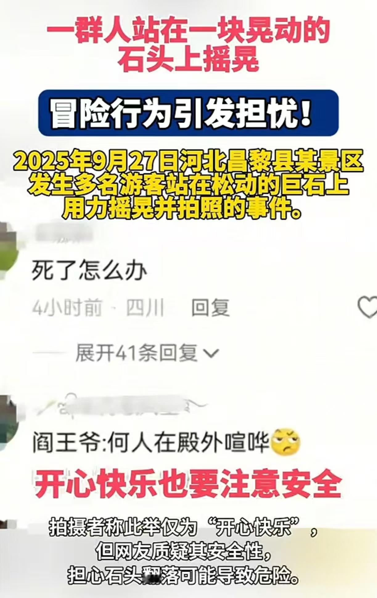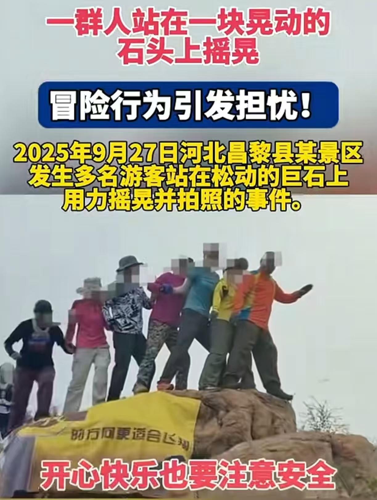 胆子也太大了!河北昌黎县一景区发生多名游客站在松动的巨石上用力摇晃,并摆弄着各种姿势拍照留念,丝毫没察觉到危险,网友:开心就好! 视频中可以看到,这是一群上了年纪的大叔和大妈,一共有7个人,他们并排站在一块晃动的巨石上,做着向前冲的姿势,不断用身体发力去晃动巨石。 从他们高声呐喊就能看得出,他们并不担心巨石会侧翻摔倒,反而是处于一种兴奋的状态。 此视频在网上曝光后,不少网友都替他们担心,这么高的高度,万一石头承受不了这么重的重量,发生侧翻,后果就不堪设想了。 追求快乐是没有错的,但也要在确保安全的前提下进行。 不怕万一,就怕一万!都是一群年纪不小的人了,做事怎么比年轻人还要疯狂! 对于这件事,要是你有不一样的看法,评论区已备好沙发,快落座一起聊聊你的想法吧~