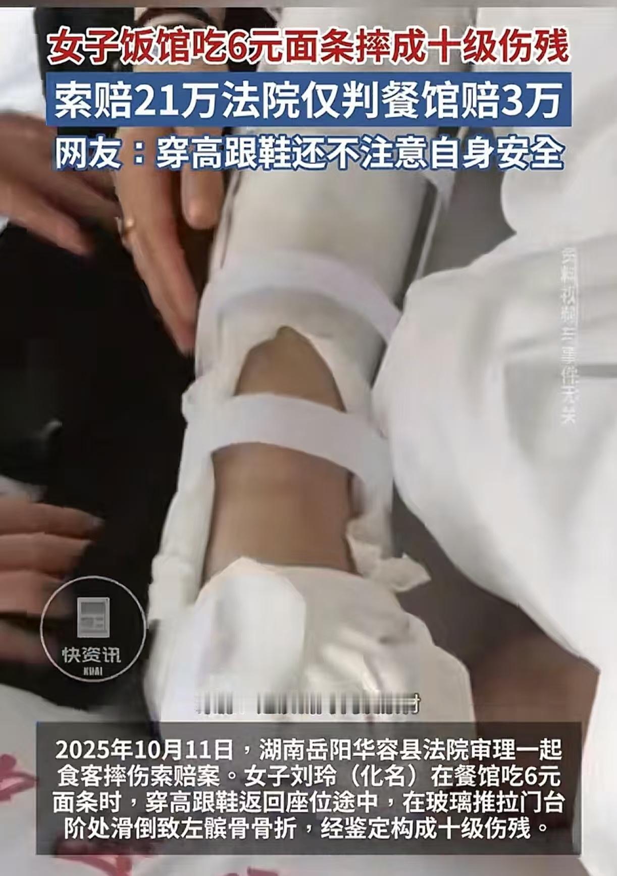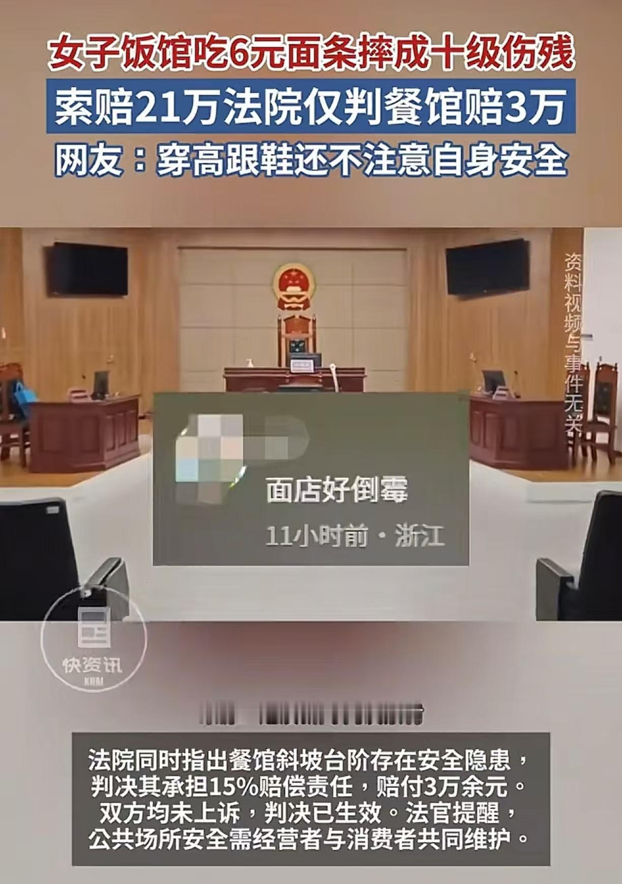 摔那讹那,餐馆蒙圈了!湖南岳阳,一女子穿高跟鞋来到一家面馆吃面,她点了一碗6块钱的面,就在返回座位,经过玻璃推拉门的台阶处摔倒受伤,经司法鉴定为十级伤残。事后,该女子起诉餐馆,索赔21万元,法院这样判了! 通过媒体报道了解到,女子先是找餐馆协商赔偿无果后,才把餐馆起诉的,起诉的理由是:餐馆未尽到安全保障义务。 而餐馆则表示,该女子自己穿高跟鞋上下台阶摔倒,属于自身疏忽的主要原因,跟餐馆无关。 但由于女子是在餐馆摔倒受伤的,医生给出的鉴定结果,需要它伤后休养180天,外加90天的护理和60天的营养。 因此,女子向餐馆索赔21万元。 而法院的判决认为,女子作为完全民事行为能力人,穿高跟鞋应尽更高注意义务,加上她未能举证餐馆存在安全隐患,所以女子应承担主要责任。 但餐馆的台阶设计也存在安全隐患的问题,没有尽到合理限度的安全保障,需要承担15%的赔偿责任。 需要给女子赔偿3万元! 此事在网上曝光后,网友评论区已经炸开了。有的网友认为,商家一定要注意了,店里要摆放“小心滑倒提示牌”,非常有用。 也有网友认为,以后商家还要在店里挂牌,穿高跟鞋的一律不准进店,否则出事责任自负。 6块钱一碗面,钱都没赚到,反而倒贴3万块钱出去,也难怪大家都在说生意难做,说到底还是讹人的成本太低了。 对此,你怎么看呢? 信息来源:逐浪新闻,素材来源网络。