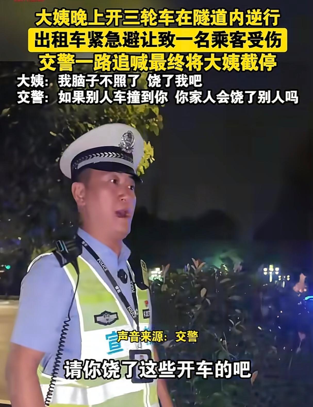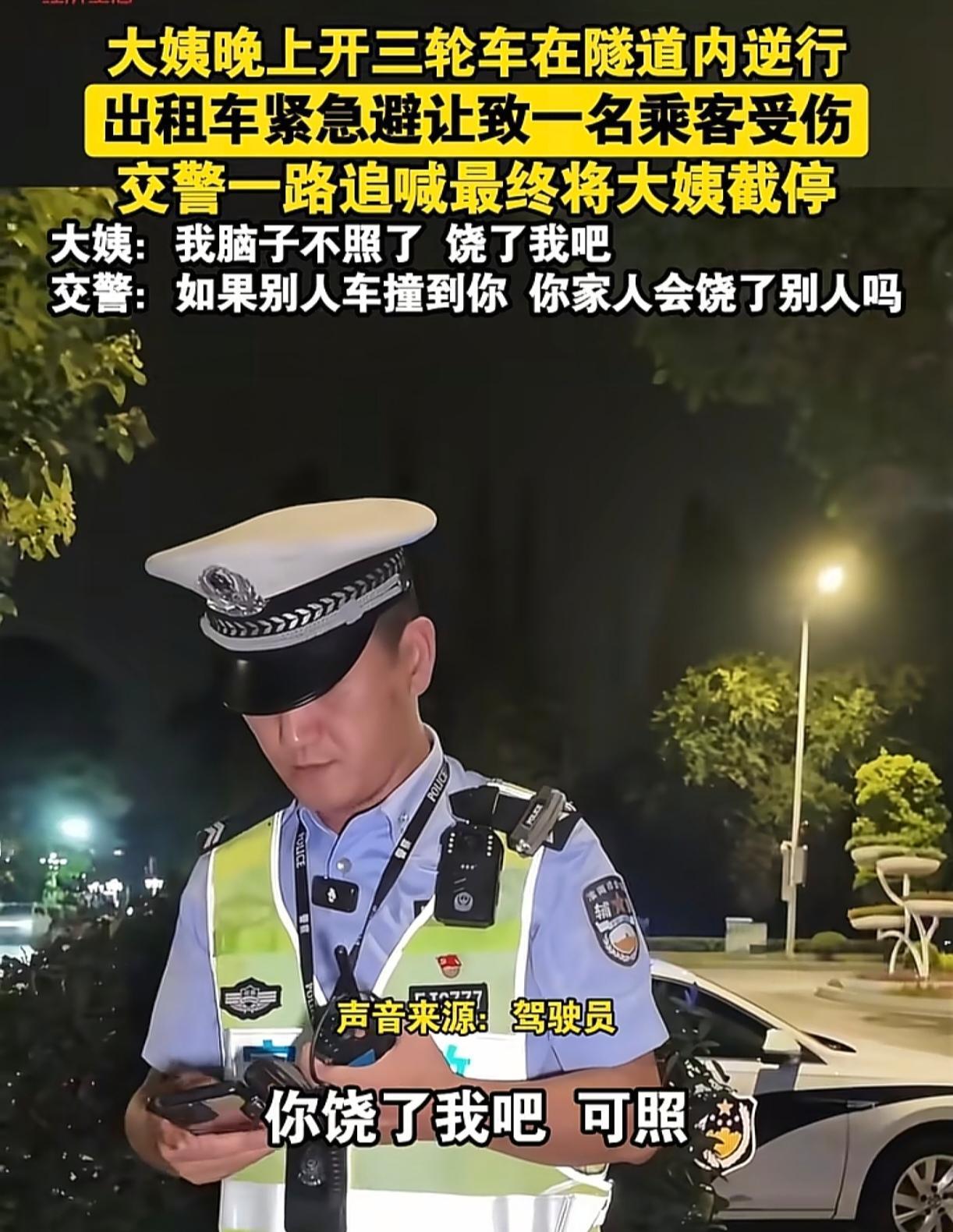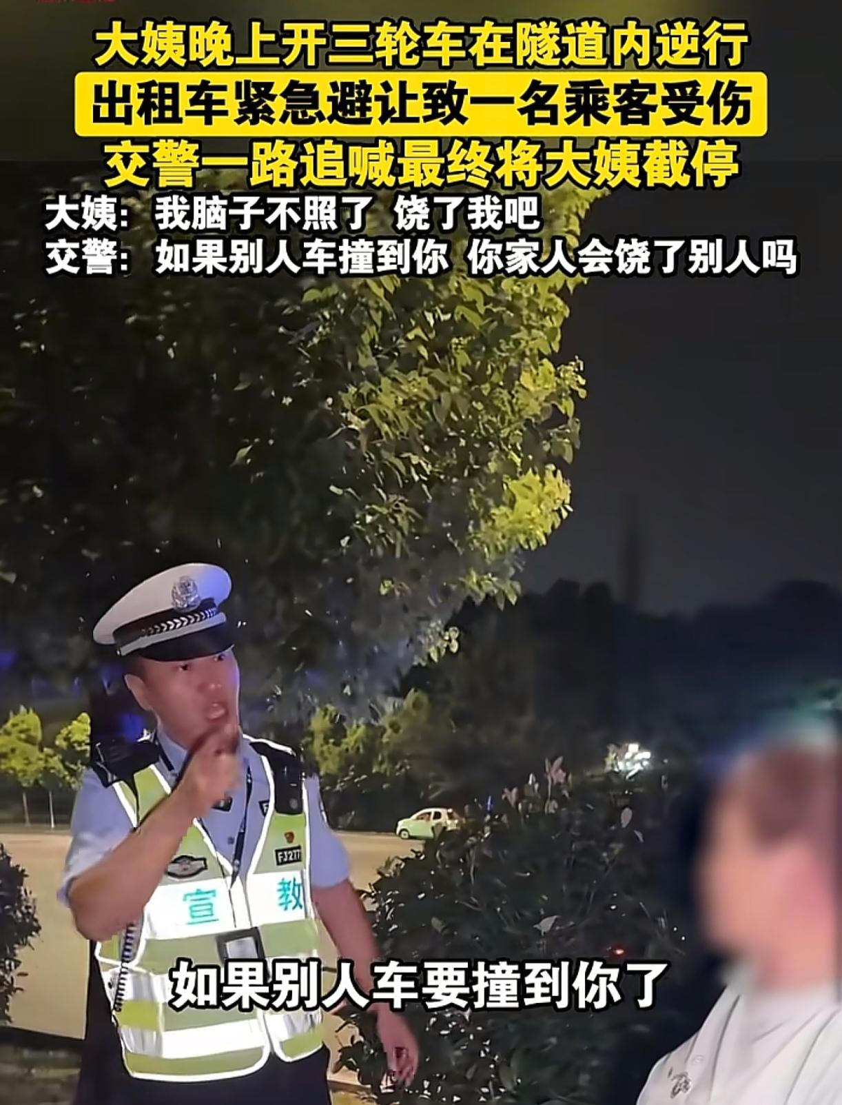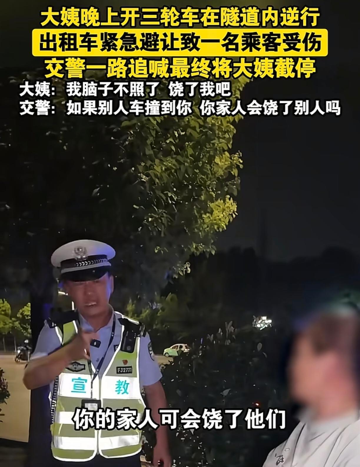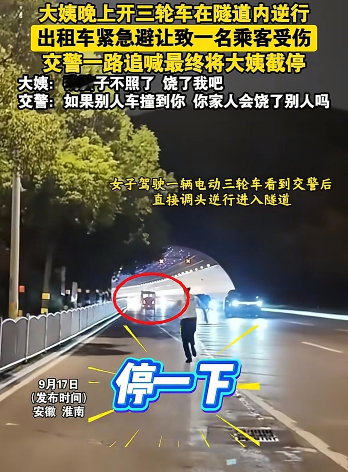 淮南老妈子最经典的一句话就是:我滴脑子不“照”了。 换句话来说,就是想装疯卖傻,不想负责任。 据淮南交警9月16日发布,一大妈开三轮电动车在路上行驶,经过一隧道时发现交警巡查,她二话不说就在隧道掉头想躲开交警巡查。 这一幕被路上交警发现后,一路追着她喊,让她停下来,可大妈就是不停,一路逆向行驶。 后来,交警联合附近执行人员,好不容易才把大妈拦下。 这时,大妈就开始卖惨了,她害怕交警处罚,一直在装疯扮傻,说自己耳朵不好使,听不到交警的喊话。 接着又把自己年纪大搬出来,想让交警绕过她这一次。 但交警有严格的执法准则,无论大妈怎么卖惨求饶,交警都没有理会她,坚决要对大妈进行处罚。 用交警的话来说,安全驾驶没有下一次的说法,事故一旦发生一次,就会造成不可挽回的后果,换谁都承担不起。 事后,民警把附近路段监控调出来后发现,在大妈逆向行驶过程中,一辆出租车为了紧急避让,导致车里有乘客受伤了。 大妈听到后还在狡辩,称自己都没有撞到人,没有出事故啊! 交警眼看大妈一直在装不懂,于是联系她的家人,把事故过程如实告知,并且作出扣车处理。 而大妈对出租车造成的伤害,会由民警作出下一步处罚处理,毫无疑问,此事定是大妈要负全责的。 此事在网上曝光后,网友都对交警的处理表示认可,都觉得交警有句话反问得特别好:如果别人撞到你,那你的家人会饶过人家吗?