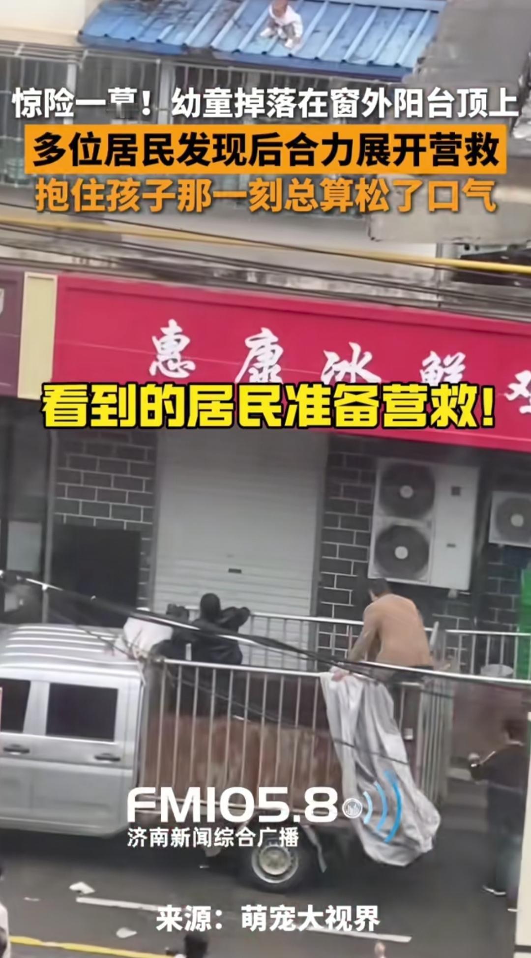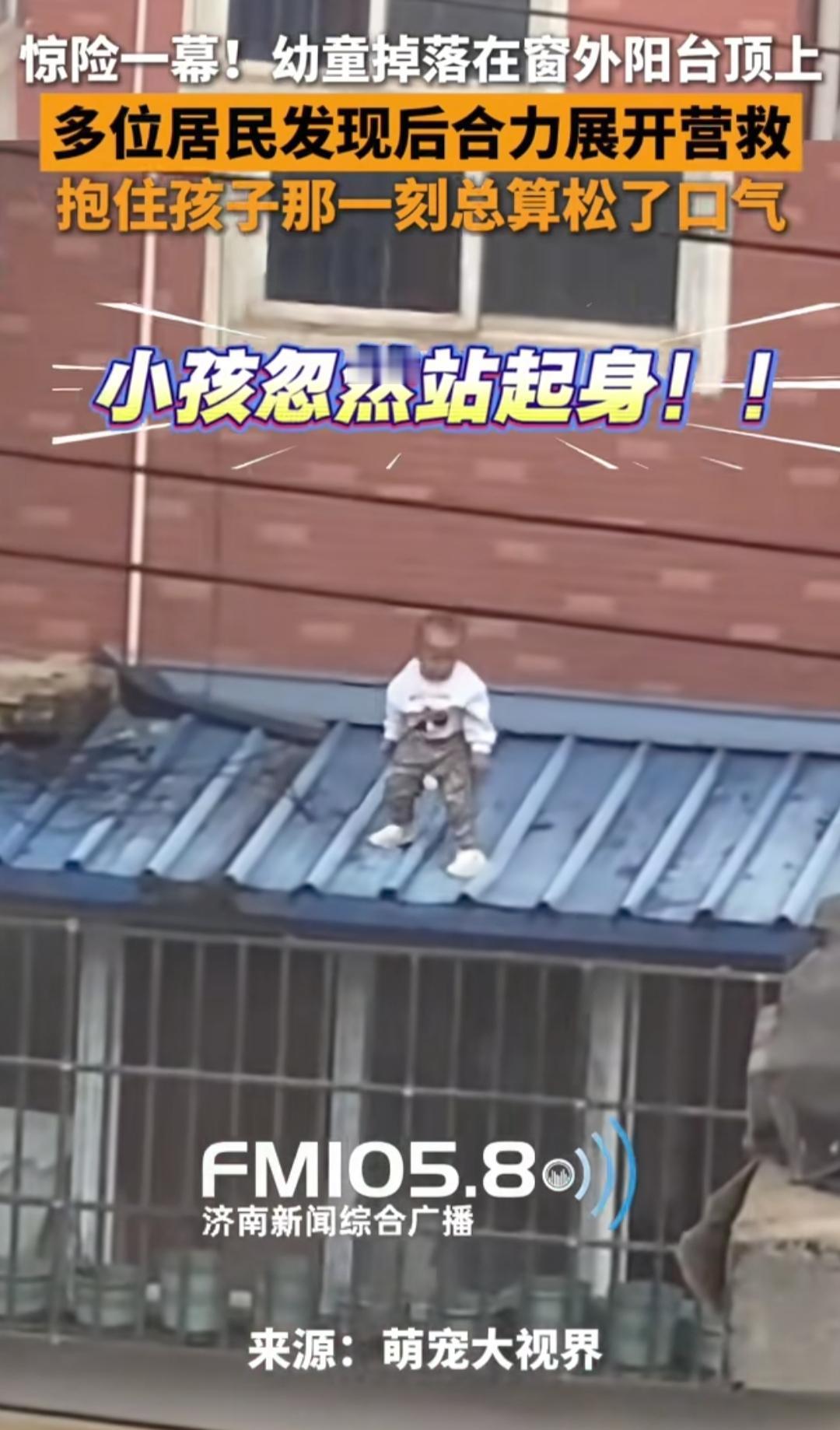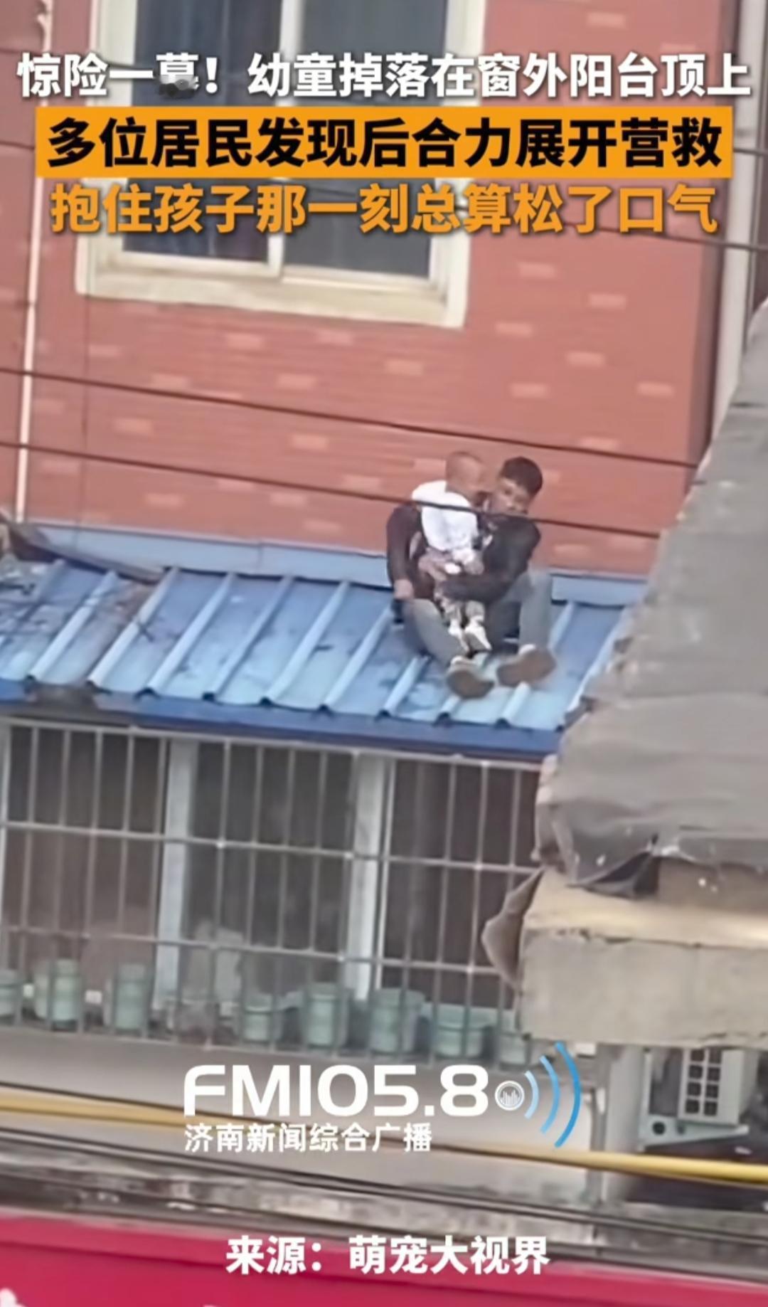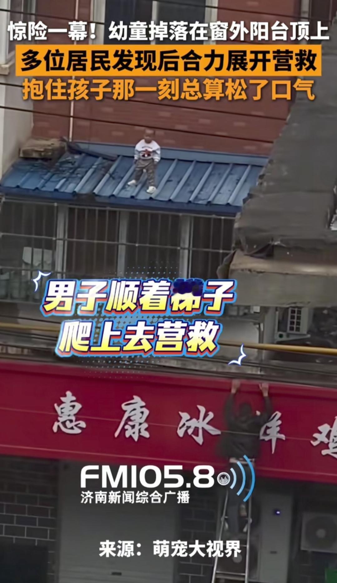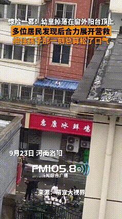 小伙子的勇敢,挽救了一个家庭!河南洛阳,一名幼童误从窗户爬到楼下遮雨棚,随时有坠楼的风险。这一幕被附近居民发现后,火速组织救援,一名年轻小伙子不顾自身安危,从一楼爬上去,成功把小孩救了下来,阻止一场悲剧的发生。 视频显示发布时间是9月23日,从网友发布的视频来看,小孩的年龄应该不超过3岁,而他所处的位置是在3楼阳台的区间。 要是没猜错,小孩应该是在家里玩耍,无意间从3楼阳台窗户爬出来的。 楼下的居民发现后,先是找来床单,防止孩子不小心掉下来。接着一名货车司机把车开到楼下,众人也顾不及自身安危,争分夺秒,想尽办法的往孩子所在位置爬了上去。 庆幸的是,孩子没有乱动,一直坚持到小伙爬上去的那一刻,成功把孩子抱住,众人才松了一口气。 事后,小伙子就抱着孩子在遮雨棚上坐着,拨打救援电话等待救援,两人都平安无事躲过一劫。 这起事件也在提醒家长,在家带孩子时,一定要细心一点,要是有事离开时,必须要做好检查,不能让孩子一个人处于危险环境里,以免造成悲剧! 对于这件事,要是你有不一样的看法,评论区已备好沙发,快落座一起聊聊你的想法吧~