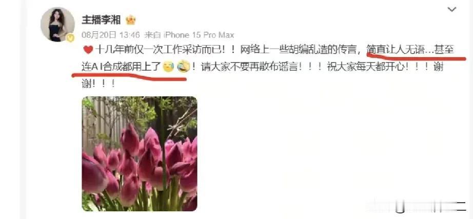 李湘就与释永信关系在个人账号做出回应,事实并非网友想象的那样,一直没有回应,相信清者自清。 自从释永信被曝光后,李湘便被推到了风口浪尖,其中两人一次采访的视频更是在网络上疯传。 一时间网络上谣言四起,很多网友说他俩关系甚密,甚至传出两人有暧昧关系。 对于甚嚣尘上的舆论,李湘这段时间一直没有回应,而谣言却愈演愈烈。 就在8月20号,李湘在个人账号上澄。 李湘表示这只是十几年前一次正常的采访而已,网络上一些胡乱编造的传言简直让人无语,甚至连AI合成都用上了。 最后李湘还让大家不要传播谣言。 这么长时间没有回应,原本想着清者自清,没必要做过多解释,没想到传言愈演愈烈,严重影响了李湘本人。 其实关于李湘与释永信的关系都是一些传言,没有确实证据,但对李湘本人的名誉以及她的家庭造成的很坏的影响。 现在李湘与她先生关系一直很好,而且还有一个女儿,从照片来看,长得也特别像李湘。 其实很多网友都不太喜欢李湘,但也不能成为传播谣言的理由。