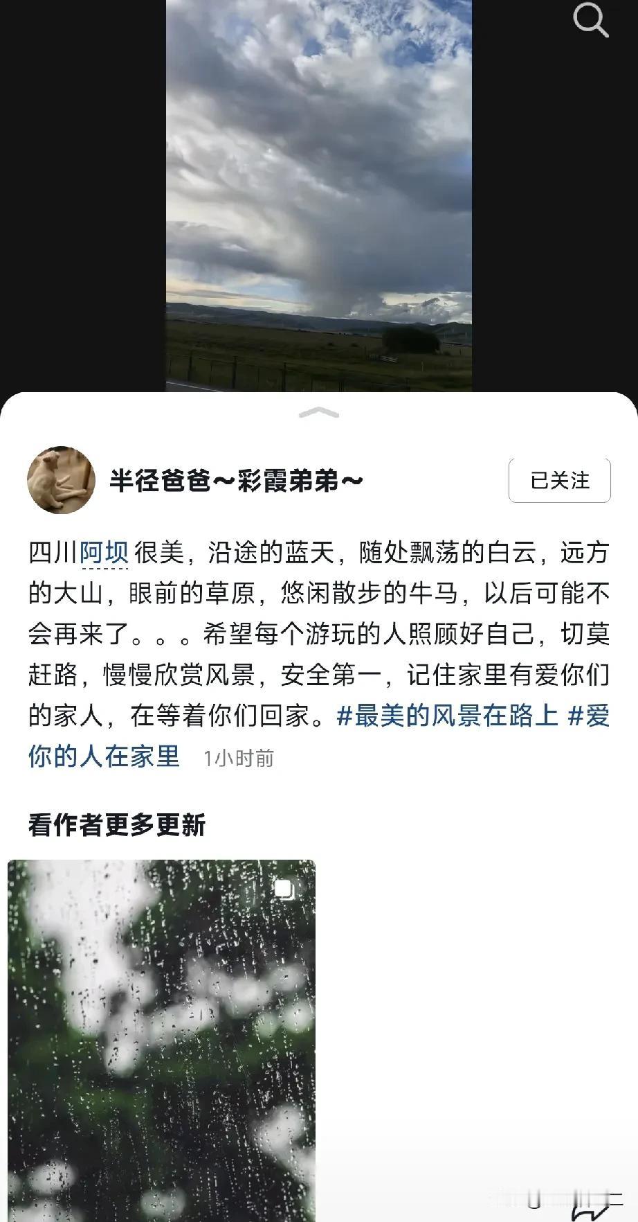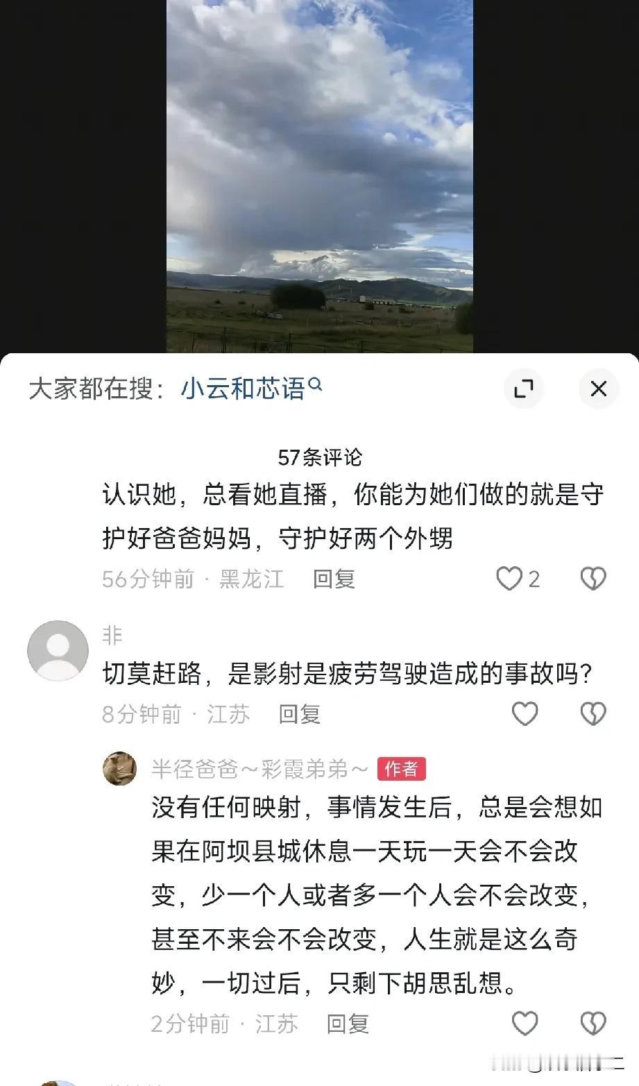明彩的弟弟已经离开了四川阿坝回江苏了,此次7人遇难事件调查结果可能出来了,至于为何发生这场悲剧他没有明说,但能看出来,有一部分司机疲劳驾驶的原因。 前几天,三个丈夫和一个弟弟来到了四川阿坝,等待事故调查结果,大家也非常想知道发生事故的原因。 就在8月21号,明彩的弟弟发文“四川阿坝很美,沿途的蓝天,随见飘荡的白云,远处的大山,眼前的草原,悠闲散步的牛马,以后可能不会再来了”。 而且他特别强调,希望旅游的人照顾好自己,切莫赶路,安全第一。 网友看到他说到“切莫赶路”深有所感,因为他们7个人的行程实在太紧张了,一天的功夫从九寨沟到色达需要14小时的山路,而且只有一个司机驾驶。 有网友觉着明彩弟弟这次发文影射了此次遇难事故,最终的调查结果是因为司机疲劳驾驶。 而明彩的弟弟予以了否认。 他否认了任何影射,只是觉得要是走到阿坝时的时候,他们能够休息一晚或就地游玩一天,不着急赶路,可能就不会发生这个悲剧。 他的想法和我们很多人都很像,每次发生不好事情,事后会后悔当初的决定,但现实不会给任何人第二次机会。 可以想象,即使平坦的高速一天开14个小时的车,也基本是超负荷运转,何况是崎岖难走的山路,需要更多的专注力,自然会更加疲劳。 还有网友拍摄了当地风景的照片,很多高山和山路,旁边还有河流。 也有网友觉得他们这样完全不顾孩子的感受,14个小时的车程,道路颠簸,孩子坐在车里也很累。 而明彩的丈夫在评论区回复了六个字“再也不会来了”,更是痛彻心扉。 这个伤心地让他失去了妻子和女儿,而且小芯语永远留在了这个地方,是他整个人生的噩梦。