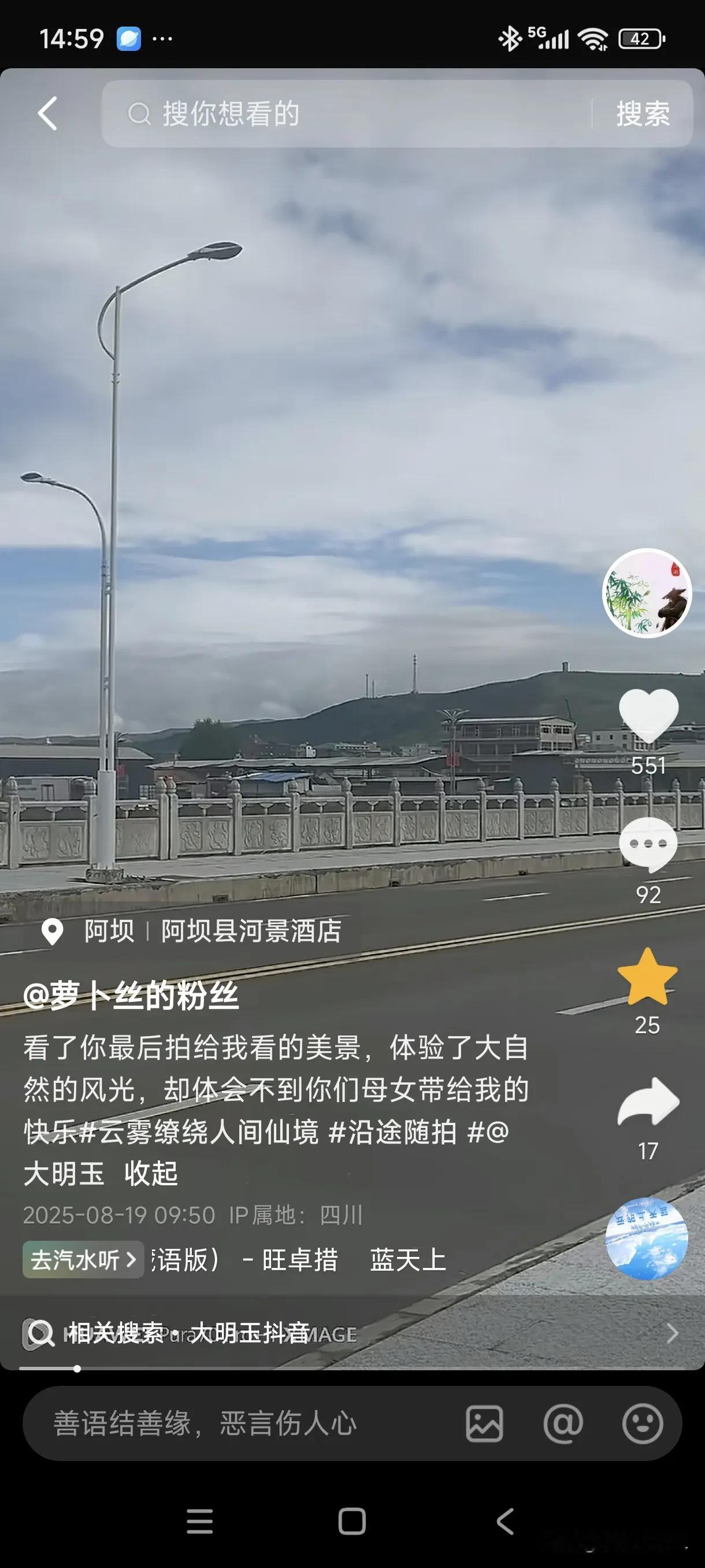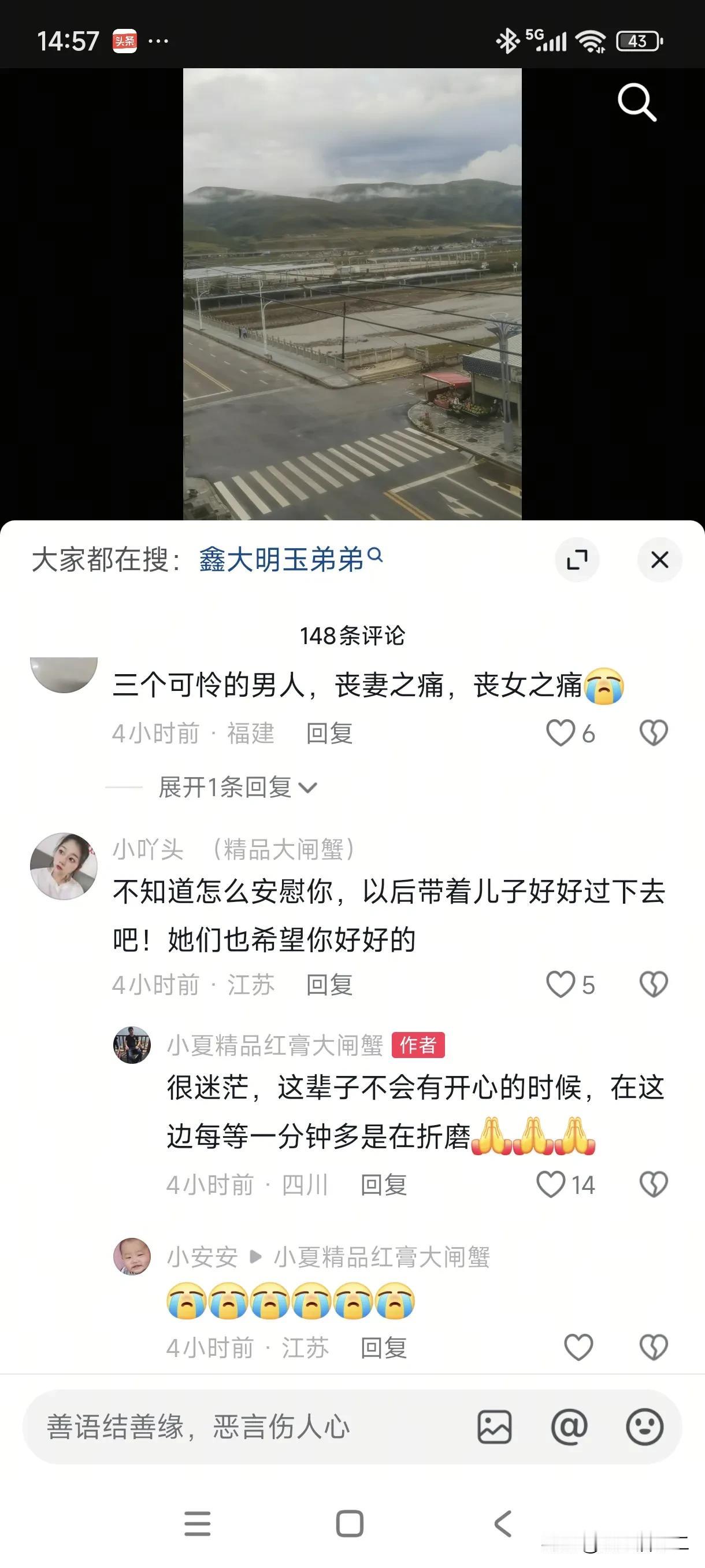 阿坝7人遇难事件已经过去49天了,现在三个丈夫一个弟弟,都在四川等待这次事故鉴定结果,而小云丈夫的一句话更是让人泪流满面。 他们被安排在安坝县河景酒店,这里离遇难地并不远,巧合的是,酒店的外面到处是河流和桥梁。 触景生情,这四个男人待在四川的每一分每一秒,对他们都是煎熬。 就像明彩弟弟说的那样,“不得不来,来这里给这个悲伤的故事收个尾。” 来到妻子遇难的地方,看着熟悉的景物,没有任何变化,妻子却不在了,小云的丈夫再也压抑不住心中的情感。 他在视频中发文“这里依旧如初,而我泪眼婆娑”。 网友看到后不知道怎么安慰他,只希望他带着儿子好好过下去。 而他却说道“很迷茫,这辈子不会有开心的时候,在这边每一份等待都是多一份折磨”。 在等待事故检查结果期间,明玉的丈夫到了明玉给她拍摄美景的地方。 可物是人非,触景生情,他在文中写道“看了你最后拍给我看的美景,体验了大自然的风光,却体会不到你们母女带给我的快乐”。 这三个可怜的男人,承受着丧妻之痛,丧女之痛,每当夜深人静时候,都会悲痛流泪,都知道为了儿子还要向前看,但又谈何容易?