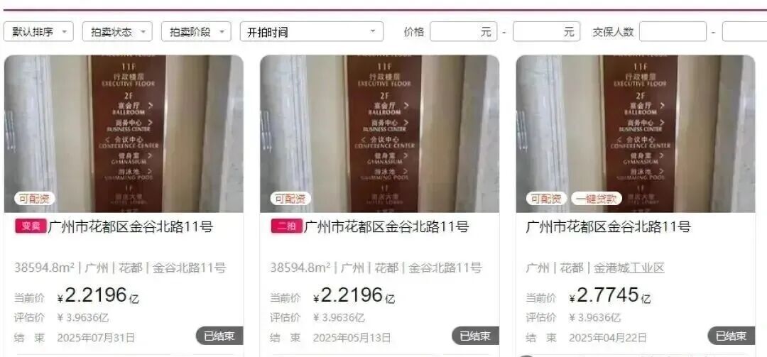 今年4月及5月,广州富力空港假日酒店在阿里资产平台先后经历了2次拍卖,均因无人出价而遭遇流拍。在7月的变卖中,依然无人竞价。记者留意到,该酒店的执行法院也是广东省广州市中级人民法院。