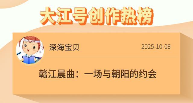 以诗意的笔触勾勒出赣江日出的动人画卷,作者将视觉的“碎金粼光”、触觉的“清冽江风”与听觉的“露水轻响”交织成多维度的清晨体验。文中对光色变化的捕捉尤为精妙,从“橘粉微光”到“鲜活的红”,再现了日出时分的色彩交响。更难得的是,在静谧的叙事中自然升华为精神隐喻——那轮挣脱云层的朝阳不仅是自然奇观,更是照亮家国记忆与文化清晨的象征。@深海宝贝>>