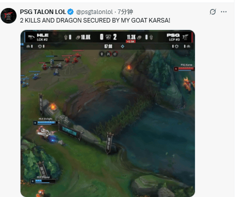 PSG:我们的GOAT Karsa拿下了两个击杀并且抢到了小龙